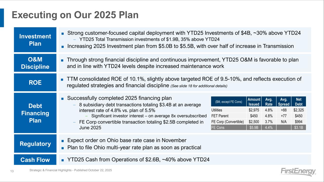 12 YTD 2025 Earnings Summary $0.51 $1.25 $1.76 $0.20 $0.05 $0.03 -$0.02 YTD24 GAAP EPS Special Items YTD24 Core EPS Distribution Integrated Stand-Alone Transmission Corp / Other $2.02 -$0.17 $1.85 YTD25 Core EPS Special Items YTD25 GAAP EPS Dx $0.74 Int $0.67 Tx $0.41 Corp ($0.57) Formula Investments +$0.05 Financing & Other -$0.02 Dx $0.88 Int $0.70 Tx $0.45 Corp ($0.27) Dx $1.08 Int $0.75 Tx $0.48 Corp ($0.29) 15% Core EPS growth Customer Demand +$0.03 O&M/Other OpEx +$0.05 Formula Investments +$0.07 Customer Demand +$0.02 O&M/Other OpEx -$0.03 Dx $1.05 Int $0.75 Tx $0.48 Corp ($0.43) (1) Certain O&M/Other OpEx increases in 2025 are a result of increased maintenance work and amortization of deferred costs included in new base rates (2) Includes -$0.04 of dilution on FET 30% sale that closed in March 2024 Financing & Other -$0.03 Financing & Other (2) -$0.02 Financing & Other +$0.01 Strategic & Financial Highlights - October 22, 2025 See slides 21-28 for GAAP to Non-GAAP reconciliations and a description of special items New PA Rates (1) +$0.11 (Rates +$0.23, O&M/Other OpEx -$0.12) New WV/NJ Rates (1) +$0.02 (Rates +$0.08, O&M/Other OpEx -$0.06) Strong YTD performance has enabled us to raise 2025 guidance midpoint and narrow the range while accelerating expenses into 2025 FE Earnings Drivers Summary New Base Rates(1) and Formula Investments, from execution of our regulated strategies Higher customer demand Lower O&M/Other OpEx, from continuous improvement initiatives net of increased maintenance work accelerated from future years