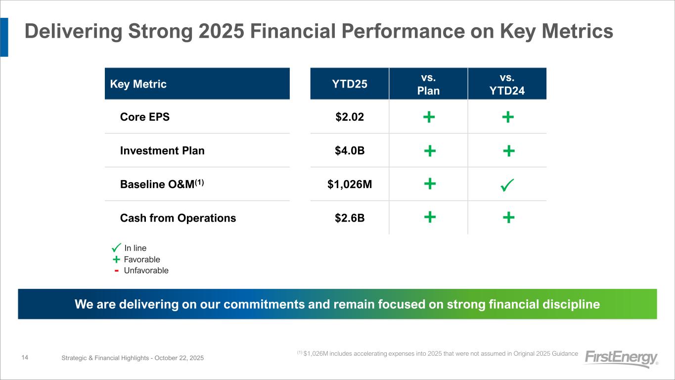 Executing on Our 2025 Plan ■ Successfully completed 2025 financing plan – 8 subsidiary debt transactions totaling $3.4B at an average interest rate of 4.8% vs. plan of 5.5% – Significant investor interest – on average 8x oversubscribed – FE Corp convertible transaction totaling $2.5B completed in June 2025 Strategic & Financial Highlights - Published October 22, 202513 ■ Through strong financial discipline and continuous improvement, YTD25 O&M is favorable to plan and in line with YTD24 levels despite increased maintenance work ■ Strong customer-focused capital deployment with YTD25 Investments of $4B, ~30% above YTD24 – YTD25 Total Transmission investments of $1.9B, 35% above YTD24 ■ Increasing 2025 Investment plan from $5.0B to $5.5B, with over half of increase in Transmission Investment Plan Debt Financing Plan O&M Discipline ROE ■ TTM consolidated ROE of 10.1%, slightly above targeted ROE of 9.5-10%, and reflects execution of regulated strategies and financial discipline (See slide 18 for additional details) Regulatory ■ Expect order on Ohio base rate case in November ■ Plan to file Ohio multi-year rate plan as soon as practical ■ YTD25 Cash from Operations of $2.6B, ~40% above YTD24Cash Flow ($M, except FE Cons) Amount Issued Avg. Rate Avg. Spread Net Debt Utilities $2,975 4.8% +88 $2,325 FET Parent $450 4.8% +77 $450 FE Corp (Convertible) $2,500 3.7% N/A $994 FE Cons $5.9B 4.4% $3.1B