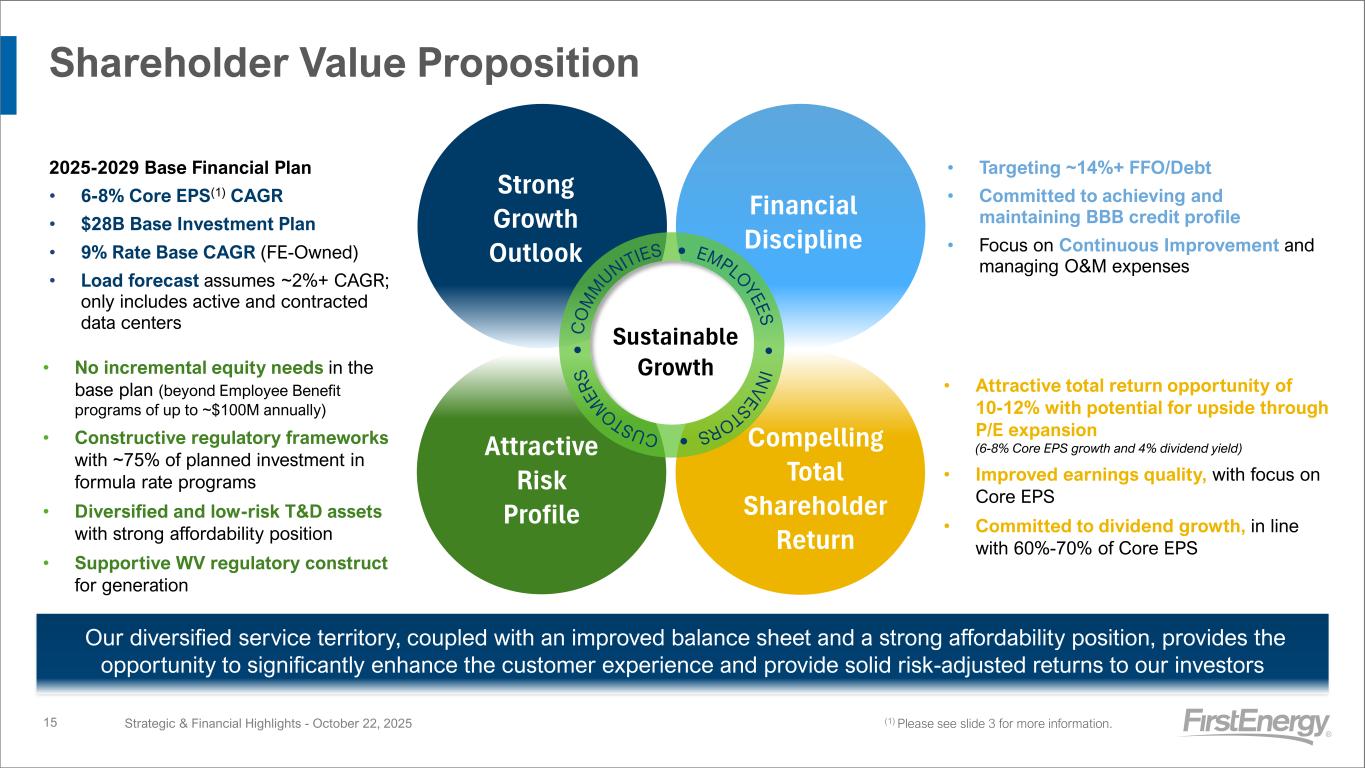 Delivering Strong 2025 Financial Performance on Key Metrics Strategic & Financial Highlights - October 22, 2025 We are delivering on our commitments and remain focused on strong financial discipline Key Metric YTD25 vs. Plan vs. YTD24 Core EPS $2.02 Investment Plan $4.0B Baseline O&M(1) $1,026M Cash from Operations $2.6B + +  In line Favorable + + + 14 - Unfavorable + +  (1) $1,026M includes accelerating expenses into 2025 that were not assumed in Original 2025 Guidance +