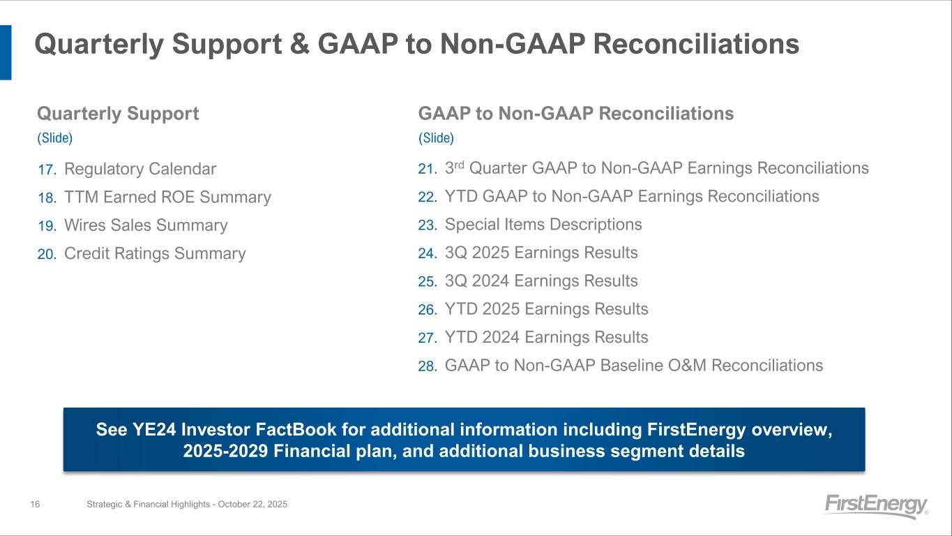 Shareholder Value Proposition Strategic & Financial Highlights - October 22, 202515 (1) Please see slide 3 for more information. • Targeting ~14%+ FFO/Debt • Committed to achieving and maintaining BBB credit profile • Focus on Continuous Improvement and managing O&M expenses • Attractive total return opportunity of 10-12% with potential for upside through P/E expansion (6-8% Core EPS growth and 4% dividend yield) • Improved earnings quality, with focus on Core EPS • Committed to dividend growth, in line with 60%-70% of Core EPS 2025-2029 Base Financial Plan • 6-8% Core EPS(1) CAGR • $28B Base Investment Plan • 9% Rate Base CAGR (FE-Owned) • Load forecast assumes ~2%+ CAGR; only includes active and contracted data centers • No incremental equity needs in the base plan (beyond Employee Benefit programs of up to ~$100M annually) • Constructive regulatory frameworks with ~75% of planned investment in formula rate programs • Diversified and low-risk T&D assets with strong affordability position • Supportive WV regulatory construct for generation Financial Discipline Compelling Total Shareholder Return Attractive Risk Profile Strong Growth Outlook Sustainable Growth Our diversified service territory, coupled with an improved balance sheet and a strong affordability position, provides the opportunity to significantly enhance the customer experience and provide solid risk-adjusted returns to our investors IN V E STORS•CUSTO M E R S • C O M M U NITIES • EMPLO Y E E S •