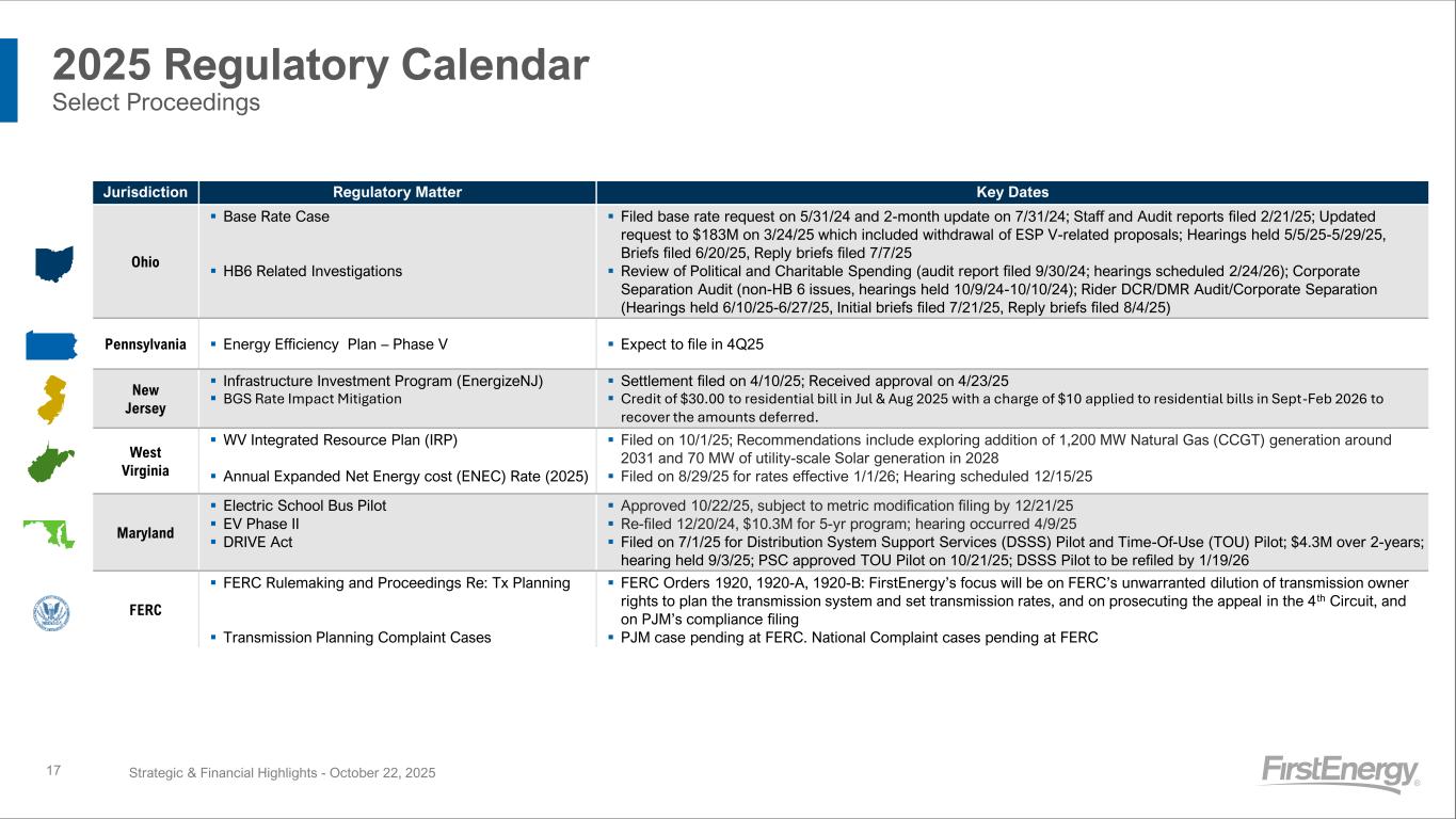Jurisdiction Regulatory Matter Key Dates Ohio ▪ Base Rate Case ▪ HB6 Related Investigations ▪ Filed base rate request on 5/31/24 and 2-month update on 7/31/24; Staff and Audit reports filed 2/21/25; Updated request to $183M on 3/24/25 which included withdrawal of ESP V-related proposals; Hearings held 5/5/25-5/29/25, Briefs filed 6/20/25, Reply briefs filed 7/7/25 ▪ Review of Political and Charitable Spending (audit report filed 9/30/24; hearings scheduled 2/24/26); Corporate Separation Audit (non-HB 6 issues, hearings held 10/9/24-10/10/24); Rider DCR/DMR Audit/Corporate Separation (Hearings held 6/10/25-6/27/25, Initial briefs filed 7/21/25, Reply briefs filed 8/4/25) Pennsylvania ▪ Energy Efficiency Plan – Phase V ▪ Expect to file in 4Q25 New Jersey ▪ Infrastructure Investment Program (EnergizeNJ) ▪ BGS Rate Impact Mitigation ▪ Settlement filed on 4/10/25; Received approval on 4/23/25 ▪ Credit of $30.00 to residential bill in Jul & Aug 2025 with a charge of $10 applied to residential bills in Sept-Feb 2026 to recover the amounts deferred. West Virginia ▪ WV Integrated Resource Plan (IRP) ▪ Annual Expanded Net Energy cost (ENEC) Rate (2025) ▪ Filed on 10/1/25; Recommendations include exploring addition of 1,200 MW Natural Gas (CCGT) generation around 2031 and 70 MW of utility-scale Solar generation in 2028 ▪ Filed on 8/29/25 for rates effective 1/1/26; Hearing scheduled 12/15/25 Maryland ▪ Electric School Bus Pilot ▪ EV Phase II ▪ DRIVE Act ▪ Approved 10/22/25, subject to metric modification filing by 12/21/25 ▪ Re-filed 12/20/24, $10.3M for 5-yr program; hearing occurred 4/9/25 ▪ Filed on 7/1/25 for Distribution System Support Services (DSSS) Pilot and Time-Of-Use (TOU) Pilot; $4.3M over 2-years; hearing held 9/3/25; PSC approved TOU Pilot on 10/21/25; DSSS Pilot to be refiled by 1/19/26 FERC ▪ FERC Rulemaking and Proceedings Re: Tx Planning ▪ Transmission Planning Complaint Cases ▪ FERC Orders 1920, 1920-A, 1920-B: FirstEnergy’s focus will be on FERC’s unwarranted dilution of transmission owner rights to plan the transmission system and set transmission rates, and on prosecuting the appeal in the 4th Circuit, and on PJM’s compliance filing ▪ PJM case pending at FERC. National Complaint cases pending at FERC 2025 Regulatory Calendar Select Proceedings Strategic & Financial Highlights - October 22, 202517