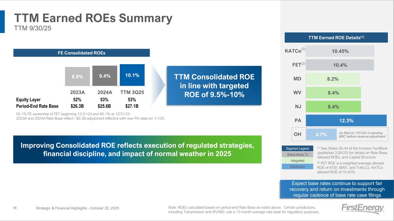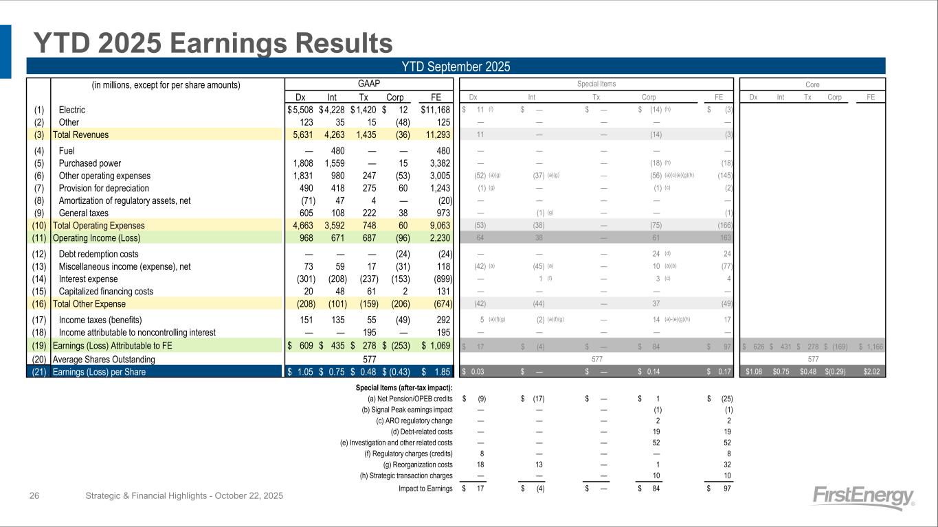 YTD 2025 Earnings Results Strategic & Financial Highlights - October 22, 202526 YTD September 2025 (in millions, except for per share amounts) GAAP Special Items Core Dx Int Tx Corp FE Dx Int Tx Corp FE Dx Int Tx Corp FE (1) Electric $ 5,508 $ 4,228 $ 1,420 $ 12 $11,168 $ 11 (f) $ — $ — $ (14) (h) $ (3) (2) Other 123 35 15 (48) 125 — — — — — (3) Total Revenues 5,631 4,263 1,435 (36) 11,293 11 — — (14) (3) (4) Fuel — 480 — — 480 — — — — — (5) Purchased power 1,808 1,559 — 15 3,382 — — — (18) (h) (18) (6) Other operating expenses 1,831 980 247 (53) 3,005 (52) (a)(g) (37) (a)(g) — (56) (a)(c)(e)(g)(h) (145) (7) Provision for depreciation 490 418 275 60 1,243 (1) (g) — — (1) (c) (2) (8) Amortization of regulatory assets, net (71) 47 4 — (20) — — — — — (9) General taxes 605 108 222 38 973 — (1) (g) — — (1) (10) Total Operating Expenses 4,663 3,592 748 60 9,063 (53) (38) — (75) (166) (11) Operating Income (Loss) 968 671 687 (96) 2,230 64 38 — 61 163 (12) Debt redemption costs — — — (24) (24) — — — 24 (d) 24 (13) Miscellaneous income (expense), net 73 59 17 (31) 118 (42) (a) (45) (a) — 10 (a)(b) (77) (14) Interest expense (301) (208) (237) (153) (899) — 1 (f) — 3 (c) 4 (15) Capitalized financing costs 20 48 61 2 131 — — — — — (16) Total Other Expense (208) (101) (159) (206) (674) (42) (44) — 37 (49) (17) Income taxes (benefits) 151 135 55 (49) 292 5 (a)(f)(g) (2) (a)(f)(g) — 14 (a)-(e)(g)(h) 17 (18) Income attributable to noncontrolling interest — — 195 — 195 — — — — — (19) Earnings (Loss) Attributable to FE $ 609 $ 435 $ 278 $ (253) $ 1,069 $ 17 $ (4) $ — $ 84 $ 97 $ 626 $ 431 $ 278 $ (169) $ 1,166 (20) Average Shares Outstanding 577 577 577 (21) Earnings (Loss) per Share $ 1.05 $ 0.75 $ 0.48 $ (0.43) $ 1.85 $ 0.03 $ — $ — $ 0.14 $ 0.17 $1.08 $0.75 $0.48 $(0.29) $2.02 Special Items (after-tax impact): (a) (a) Net Pension/OPEB credits $ (9) $ (17) $ — $ 1 $ (25) (b) (b) Signal Peak earnings impact — — — (1) (1) (c) (c) ARO regulatory change — — — 2 2 (d) (d) Debt-related costs — — — 19 19 (e) (e) Investigation and other related costs — — — 52 52 (f) (f) Regulatory charges (credits) 8 — — — 8 (g) (g) Reorganization costs 18 13 — 1 32 (h) (h) Strategic transaction charges — — — 10 10 Impact to Earnings $ 17 $ (4) $ — $ 84 $ 97