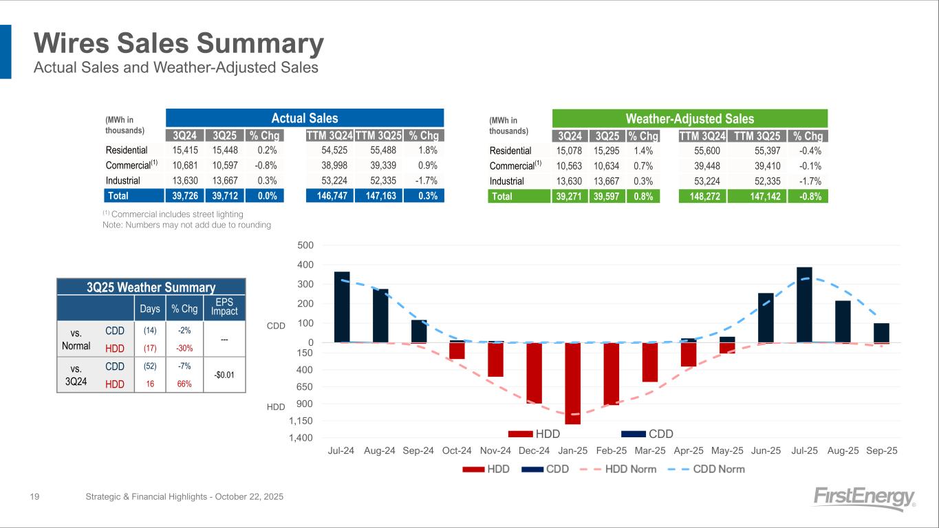 TTM Earned ROEs Summary TTM 9/30/25 Strategic & Financial Highlights - October 22, 202518 8.8% 9.4% 10.1% 2023A 2024A TTM 3Q25 TTM Consolidated ROE in line with targeted ROE of 9.5%-10% Segment Legend Stand-Alone Tx Integrated Distribution Equity Layer 52% 53% 53% Period-End Rate Base $26.3B $25.6B $27.1B 4.7% 12.3% 8.4% 8.4% 8.2% 10.4% 10.45% OH PA NJ WV MD FET KATCo As filed on 7/31/24 in pending BRC before revenue adjustment FE Consolidated ROEs TTM Earned ROE Details(1) Expect base rates continue to support fair recovery and return on investments through regular cadence of base rate case filings (1) See Slides 26-44 of the Investor FactBook (published 2/26/25) for details on Rate Base, Allowed ROEs, and Capital Structure (2) FET ROE is a weighted average allowed ROE of ATSI, MAIT, and TrAILCo. KATCo allowed ROE of 10.45%. (2) 50.1% FE ownership of FET beginning 12/31/24 and 80.1% at 12/31/23. 2023A and 2024A Rate Base reflect ~$0.2B adjustment effective with new PA rates on 1/1/25. Note: ROEs calculated based on period-end Rate Base as noted above. Certain jurisdictions, including Transmission and WV/MD, use a 13-month average rate base for regulatory purposes. Improving Consolidated ROE reflects execution of regulated strategies, financial discipline, and impact of normal weather in 2025 (2)