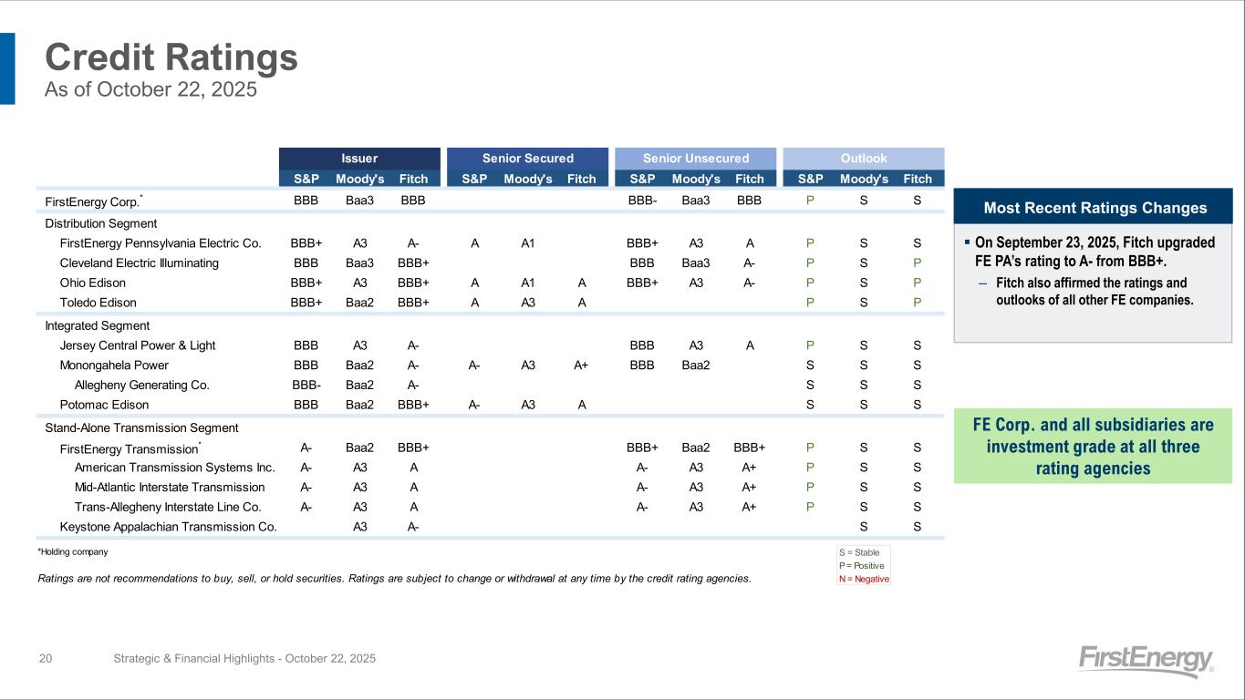 ▪ On September 23, 2025, Fitch upgraded FE PA’s rating to A- from BBB+. ‒ Fitch also affirmed the ratings and outlooks of all other FE companies. Credit Ratings As of October 22, 2025 Strategic & Financial Highlights - October 22, 2025 Most Recent Ratings Changes FE Corp. and all subsidiaries are investment grade at all three rating agencies 20 As of 9/23/25 S&P Moody's Fitch S&P Moody's Fitch S&P Moody's Fitch S&P Moody's Fitch FirstEnergy Corp.* BBB Baa3 BBB BBB- Baa3 BBB P S S Distribution Segment FirstEnergy Pennsylvania Electric Co. BBB+ A3 A- A A1 BBB+ A3 A P S S Cleveland Electric Illuminating BBB Baa3 BBB+ BBB Baa3 A- P S P Ohio Edison BBB+ A3 BBB+ A A1 A BBB+ A3 A- P S P Toledo Edison BBB+ Baa2 BBB+ A A3 A P S P Integrated Segment Jersey Central Power & Light BBB A3 A- BBB A3 A P S S Monongahela Power BBB Baa2 A- A- A3 A+ BBB Baa2 S S S Allegheny Generating Co. BBB- Baa2 A- S S S Potomac Edison BBB Baa2 BBB+ A- A3 A S S S Stand-Alone Transmission Segment FirstEnergy Transmission* A- Baa2 BBB+ BBB+ Baa2 BBB+ P S S American Transmission Systems Inc. A- A3 A A- A3 A+ P S S Mid-Atlantic Interstate Transmission A- A3 A A- A3 A+ P S S Trans-Allegheny Interstate Line Co. A- A3 A A- A3 A+ P S S Keystone Appalachian Transmission Co. A3 A- S S *Holding company S = Stable P = Positive Ratings are not recommendations to buy, sell, or hold securities. Ratings are subject to change or withdrawal at any time by the credit rating agencies. N = Negative Issuer Senior Secured Senior Unsecured Outlook