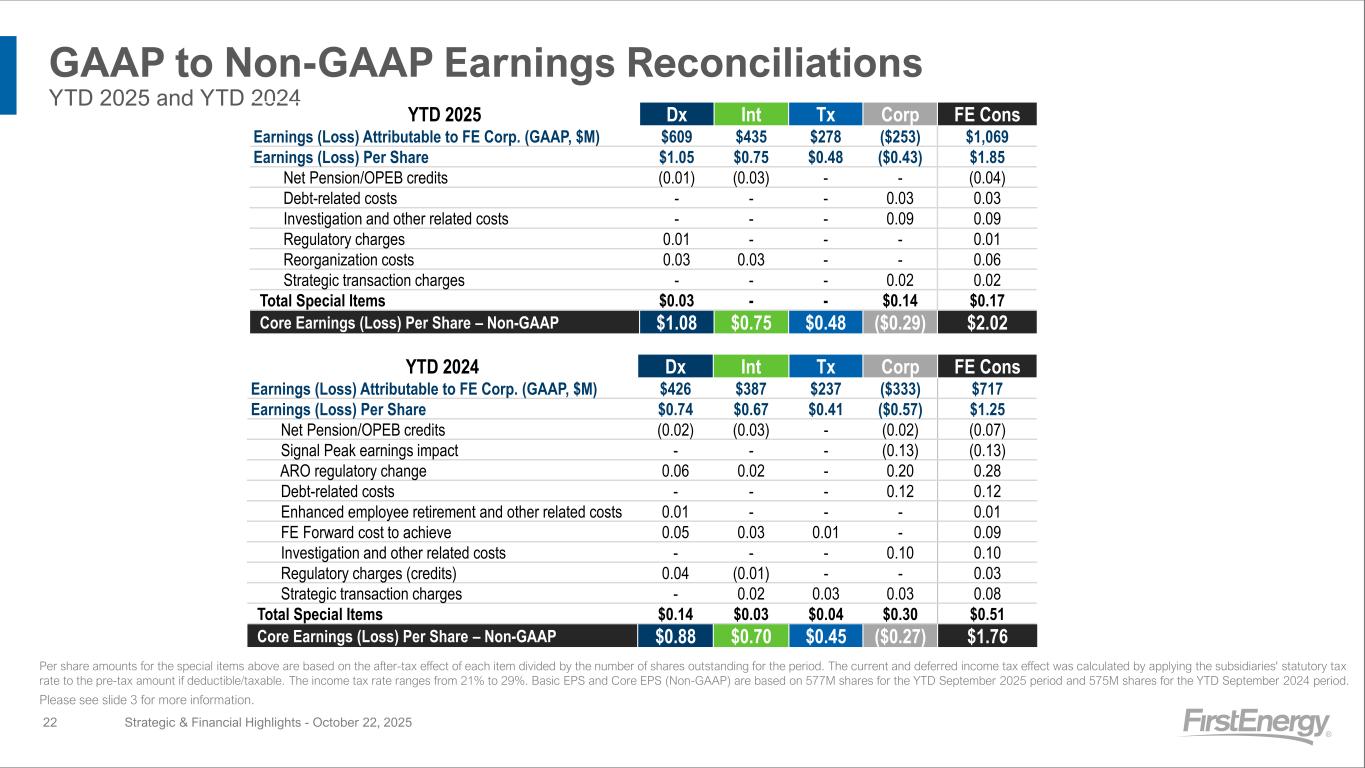 GAAP to Non-GAAP Earnings Reconciliations 3Q 2025 and 3Q 2024 Strategic & Financial Highlights - October 22, 2025 Per share amounts for the special items above are based on the after-tax effect of each item divided by the number of shares outstanding for the period. The current and deferred income tax effect was calculated by applying the subsidiaries' statutory tax rate to the pre-tax amount if deductible/taxable. The income tax rate ranges from 21% to 29%. Basic EPS and Core EPS (Non-GAAP) are based on 577M shares for the Third Quarter of 2025 and 576M shares for the Third Quarter of 2024. Please see slide 3 for more information. 3Q 2025 Dx Int Tx Corp FE Cons Earnings (Loss) Attributable to FE Corp. (GAAP, $M) $230 $183 $122 ($94) $441 Earnings (Loss) Per Share $0.40 $0.32 $0.21 ($0.17) $0.76 Net Pension/OPEB credits - (0.01) - - (0.01) Investigation and other related costs - - - 0.05 0.05 Regulatory charges 0.01 - - - 0.01 Strategic transaction charges - - - 0.02 0.02 Total Special Items $0.01 ($0.01) - $0.07 $0.07 Core Earnings (Loss) Per Share – Non-GAAP $0.41 $0.31 $0.21 ($0.10) $0.83 21 3Q 2024 Dx Int Tx Corp FE Cons Earnings (Loss) Attributable to FE Corp. (GAAP, $M) $193 $197 $72 ($43) $419 Earnings (Loss) Per Share $0.34 $0.34 $0.12 ($0.07) $0.73 Net Pension/OPEB credits (0.01) (0.02) - - (0.03) Signal Peak earnings impact - - - (0.06) (0.06) Enhanced employee retirement and other related costs 0.01 - - - 0.01 FE Forward cost to achieve 0.04 0.03 0.01 - 0.08 Investigation and other related costs - - - 0.03 0.03 Total Special Items $0.04 $0.01 $0.01 ($0.03) $0.03 Core Earnings (Loss) Per Share – Non-GAAP $0.38 $0.35 $0.13 ($0.10) $0.76
