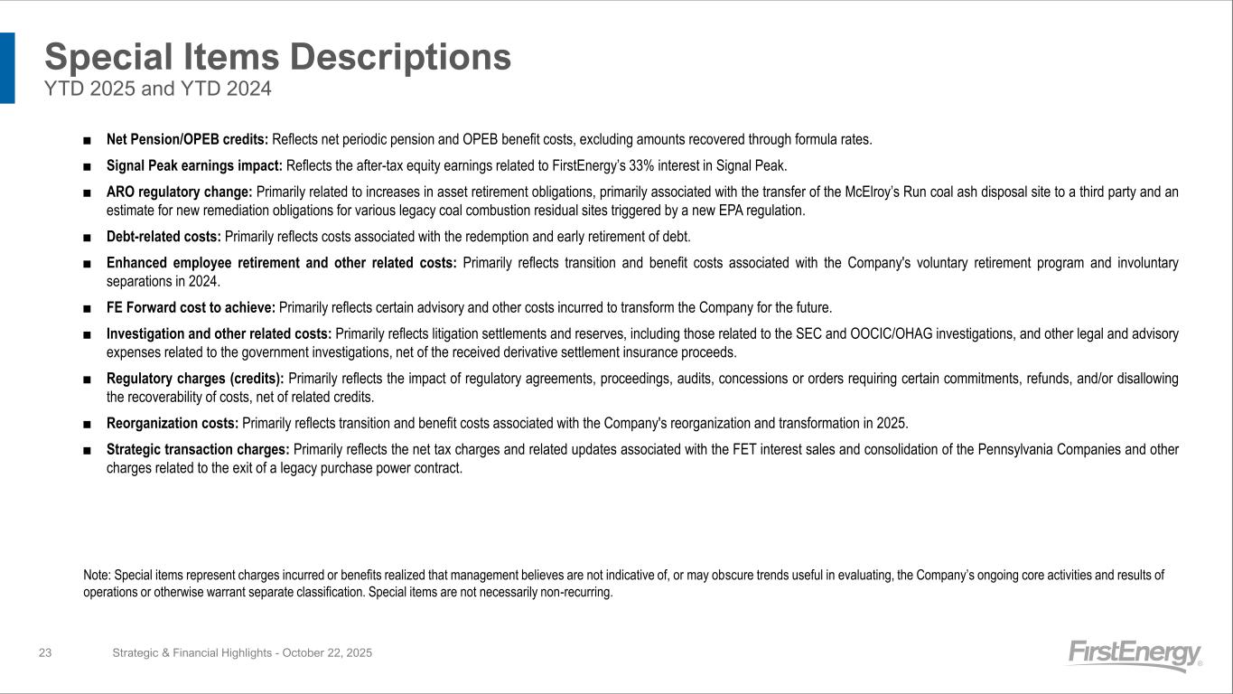 Special Items Descriptions YTD 2025 and YTD 2024 Strategic & Financial Highlights - October 22, 2025 ■ Net Pension/OPEB credits: Reflects net periodic pension and OPEB benefit costs, excluding amounts recovered through formula rates. ■ Signal Peak earnings impact: Reflects the after-tax equity earnings related to FirstEnergy’s 33% interest in Signal Peak. ■ ARO regulatory change: Primarily related to increases in asset retirement obligations, primarily associated with the transfer of the McElroy’s Run coal ash disposal site to a third party and an estimate for new remediation obligations for various legacy coal combustion residual sites triggered by a new EPA regulation. ■ Debt-related costs: Primarily reflects costs associated with the redemption and early retirement of debt. ■ Enhanced employee retirement and other related costs: Primarily reflects transition and benefit costs associated with the Company's voluntary retirement program and involuntary separations in 2024. ■ FE Forward cost to achieve: Primarily reflects certain advisory and other costs incurred to transform the Company for the future. ■ Investigation and other related costs: Primarily reflects litigation settlements and reserves, including those related to the SEC and OOCIC/OHAG investigations, and other legal and advisory expenses related to the government investigations, net of the received derivative settlement insurance proceeds. ■ Regulatory charges (credits): Primarily reflects the impact of regulatory agreements, proceedings, audits, concessions or orders requiring certain commitments, refunds, and/or disallowing the recoverability of costs, net of related credits. ■ Reorganization costs: Primarily reflects transition and benefit costs associated with the Company's reorganization and transformation in 2025. ■ Strategic transaction charges: Primarily reflects the net tax charges and related updates associated with the FET interest sales and consolidation of the Pennsylvania Companies and other charges related to the exit of a legacy purchase power contract. Note: Special items represent charges incurred or benefits realized that management believes are not indicative of, or may obscure trends useful in evaluating, the Company’s ongoing core activities and results of operations or otherwise warrant separate classification. Special items are not necessarily non-recurring. 23