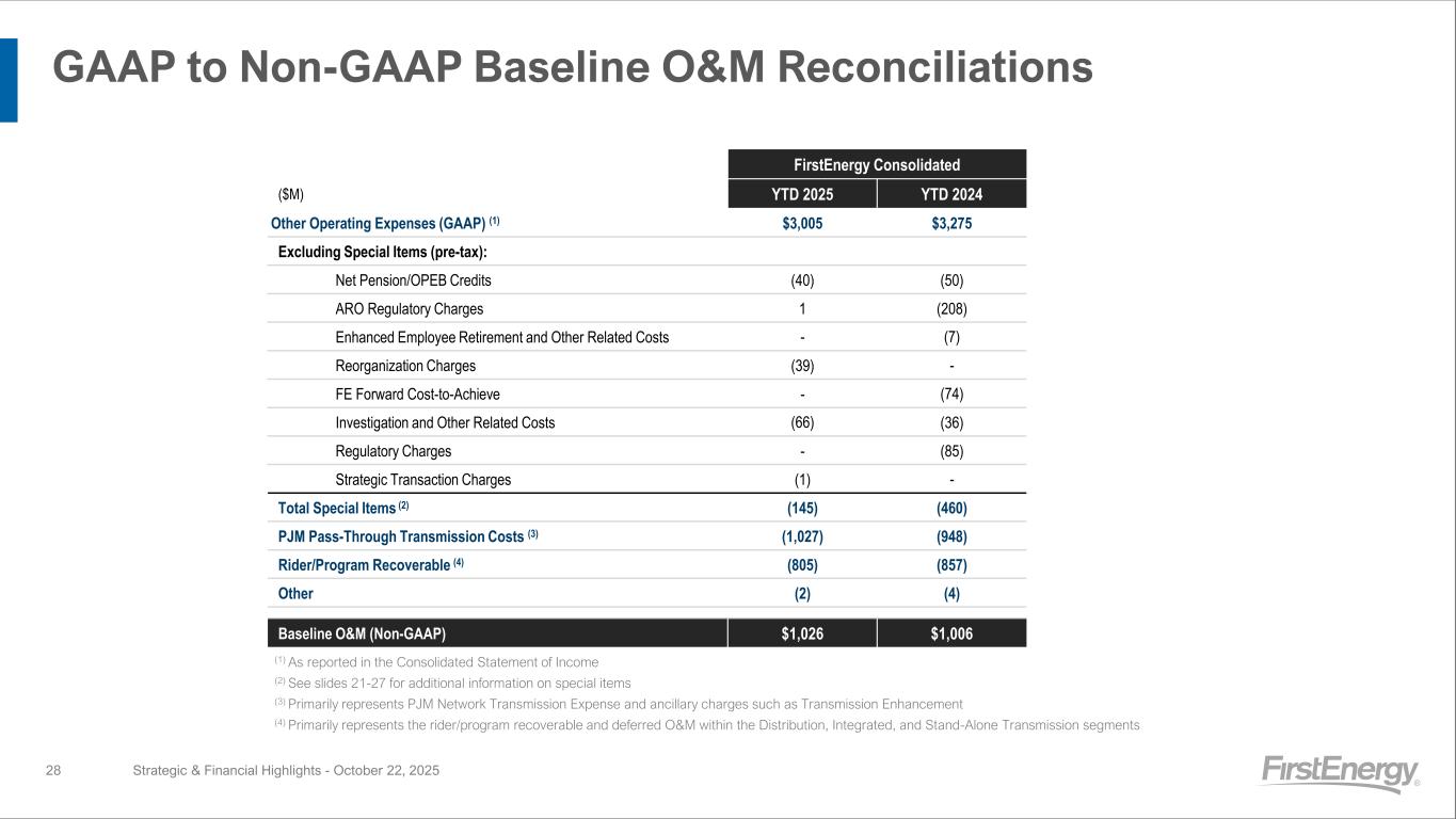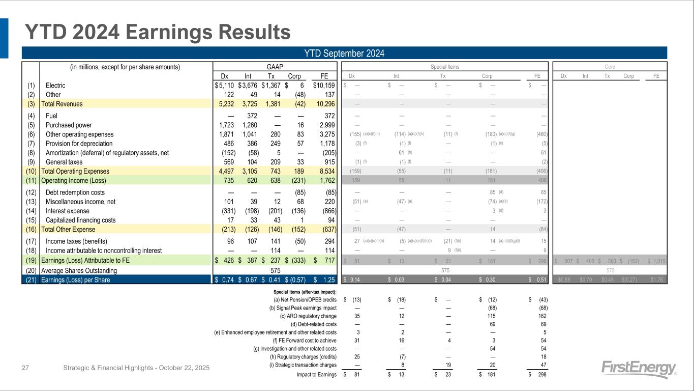YTD 2024 Earnings Results Strategic & Financial Highlights - October 22, 202527 YTD September 2024 (in millions, except for per share amounts) GAAP Special Items Core Dx Int Tx Corp FE Dx Int Tx Corp FE Dx Int Tx Corp FE (1) Electric $ 5,110 $ 3,676 $ 1,367 $ 6 $10,159 $ — $ — $ — $ — $ — (2) Other 122 49 14 (48) 137 — — — — — (3) Total Revenues 5,232 3,725 1,381 (42) 10,296 — — — — — (4) Fuel — 372 — — 372 — — — — — (5) Purchased power 1,723 1,260 — 16 2,999 — — — — — (6) Other operating expenses 1,871 1,041 280 83 3,275 (155) (a)(c)(f)(h) (114) (a)(c)(f)(h) (11) (f) (180) (a)(c)(f)(g) (460) (7) Provision for depreciation 486 386 249 57 1,178 (3) (f) (1) (f) — (1) (c) (5) (8) Amortization (deferral) of regulatory assets, net (152) (58) 5 — (205) — 61 (h) — — 61 (9) General taxes 569 104 209 33 915 (1) (f) (1) (f) — — (2) (10) Total Operating Expenses 4,497 3,105 743 189 8,534 (159) (55) (11) (181) (406) (11) Operating Income (Loss) 735 620 638 (231) 1,762 159 55 11 181 406 (12) Debt redemption costs — — — (85) (85) — — — 85 (d) 85 (13) Miscellaneous income, net 101 39 12 68 220 (51) (a) (47) (a) — (74) (a)(b) (172) (14) Interest expense (331) (198) (201) (136) (866) — — — 3 (d) 3 (15) Capitalized financing costs 17 33 43 1 94 — — — — — (16) Total Other Expense (213) (126) (146) (152) (637) (51) (47) — 14 (84) (17) Income taxes (benefits) 96 107 141 (50) 294 27 (a)(c)(e)(f)(h) (5) (a)(c)(e)(f)(h)(i) (21) (f)(i) 14 (a)-(d)(f)(g)(i) 15 (18) Income attributable to noncontrolling interest — — 114 — 114 — — 9 (f)(i) — 9 (19) Earnings (Loss) Attributable to FE $ 426 $ 387 $ 237 $ (333) $ 717 $ 81 $ 13 $ 23 $ 181 $ 298 $ 507 $ 400 $ 260 $ (152) $ 1,015 (20) Average Shares Outstanding 575 575 575 (21) Earnings (Loss) per Share $ 0.74 $ 0.67 $ 0.41 $ (0.57) $ 1.25 $ 0.14 $ 0.03 $ 0.04 $ 0.30 $ 0.51 $0.88 $0.70 $0.45 $(0.27) $1.76 Special Items (after-tax impact): (a) (a) Net Pension/OPEB credits $ (13) $ (18) $ — $ (12) $ (43) (b) (b) Signal Peak earnings impact — — — (68) (68) (c) (c) ARO regulatory change 35 12 — 115 162 (d) (d) Debt-related costs — — — 69 69 (e) (e) Enhanced employee retirement and other related costs 3 2 — — 5 (f) (f) FE Forward cost to achieve 31 16 4 3 54 (g) (g) Investigation and other related costs — — — 54 54 (h) (h) Regulatory charges (credits) 25 (7) — — 18 (i) Strategic transaction charges — 8 19 20 47 Impact to Earnings $ 81 $ 13 $ 23 $ 181 $ 298