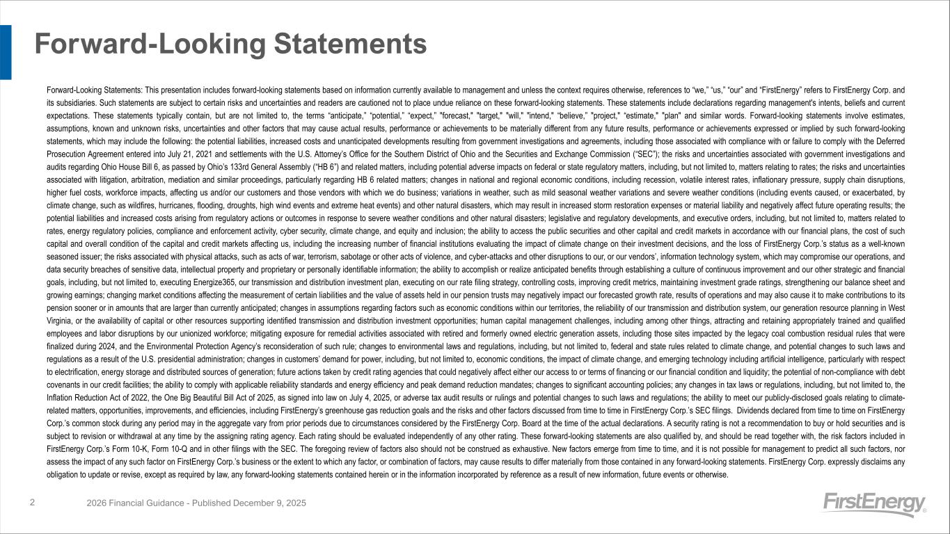 Forward-Looking Statements Forward-Looking Statements: This presentation includes forward-looking statements based on information currently available to management and unless the context requires otherwise, references to “we,” “us,” “our” and “FirstEnergy” refers to FirstEnergy Corp. and its subsidiaries. Such statements are subject to certain risks and uncertainties and readers are cautioned not to place undue reliance on these forward-looking statements. These statements include declarations regarding management's intents, beliefs and current expectations. These statements typically contain, but are not limited to, the terms “anticipate,” “potential,” “expect,” "forecast," "target," "will," "intend," “believe,” "project," “estimate," "plan" and similar words. Forward-looking statements involve estimates, assumptions, known and unknown risks, uncertainties and other factors that may cause actual results, performance or achievements to be materially different from any future results, performance or achievements expressed or implied by such forward-looking statements, which may include the following: the potential liabilities, increased costs and unanticipated developments resulting from government investigations and agreements, including those associated with compliance with or failure to comply with the Deferred Prosecution Agreement entered into July 21, 2021 and settlements with the U.S. Attorney’s Office for the Southern District of Ohio and the Securities and Exchange Commission (“SEC”); the risks and uncertainties associated with government investigations and audits regarding Ohio House Bill 6, as passed by Ohio’s 133rd General Assembly (“HB 6”) and related matters, including potential adverse impacts on federal or state regulatory matters, including, but not limited to, matters relating to rates; the risks and uncertainties associated with litigation, arbitration, mediation and similar proceedings, particularly regarding HB 6 related matters; changes in national and regional economic conditions, including recession, volatile interest rates, inflationary pressure, supply chain disruptions, higher fuel costs, workforce impacts, affecting us and/or our customers and those vendors with which we do business; variations in weather, such as mild seasonal weather variations and severe weather conditions (including events caused, or exacerbated, by climate change, such as wildfires, hurricanes, flooding, droughts, high wind events and extreme heat events) and other natural disasters, which may result in increased storm restoration expenses or material liability and negatively affect future operating results; the potential liabilities and increased costs arising from regulatory actions or outcomes in response to severe weather conditions and other natural disasters; legislative and regulatory developments, and executive orders, including, but not limited to, matters related to rates, energy regulatory policies, compliance and enforcement activity, cyber security, climate change, and equity and inclusion; the ability to access the public securities and other capital and credit markets in accordance with our financial plans, the cost of such capital and overall condition of the capital and credit markets affecting us, including the increasing number of financial institutions evaluating the impact of climate change on their investment decisions, and the loss of FirstEnergy Corp.’s status as a well-known seasoned issuer; the risks associated with physical attacks, such as acts of war, terrorism, sabotage or other acts of violence, and cyber-attacks and other disruptions to our, or our vendors’, information technology system, which may compromise our operations, and data security breaches of sensitive data, intellectual property and proprietary or personally identifiable information; the ability to accomplish or realize anticipated benefits through establishing a culture of continuous improvement and our other strategic and financial goals, including, but not limited to, executing Energize365, our transmission and distribution investment plan, executing on our rate filing strategy, controlling costs, improving credit metrics, maintaining investment grade ratings, strengthening our balance sheet and growing earnings; changing market conditions affecting the measurement of certain liabilities and the value of assets held in our pension trusts may negatively impact our forecasted growth rate, results of operations and may also cause it to make contributions to its pension sooner or in amounts that are larger than currently anticipated; changes in assumptions regarding factors such as economic conditions within our territories, the reliability of our transmission and distribution system, our generation resource planning in West Virginia, or the availability of capital or other resources supporting identified transmission and distribution investment opportunities; human capital management challenges, including among other things, attracting and retaining appropriately trained and qualified employees and labor disruptions by our unionized workforce; mitigating exposure for remedial activities associated with retired and formerly owned electric generation assets, including those sites impacted by the legacy coal combustion residual rules that were finalized during 2024, and the Environmental Protection Agency’s reconsideration of such rule; changes to environmental laws and regulations, including, but not limited to, federal and state rules related to climate change, and potential changes to such laws and regulations as a result of the U.S. presidential administration; changes in customers’ demand for power, including, but not limited to, economic conditions, the impact of climate change, and emerging technology including artificial intelligence, particularly with respect to electrification, energy storage and distributed sources of generation; futu