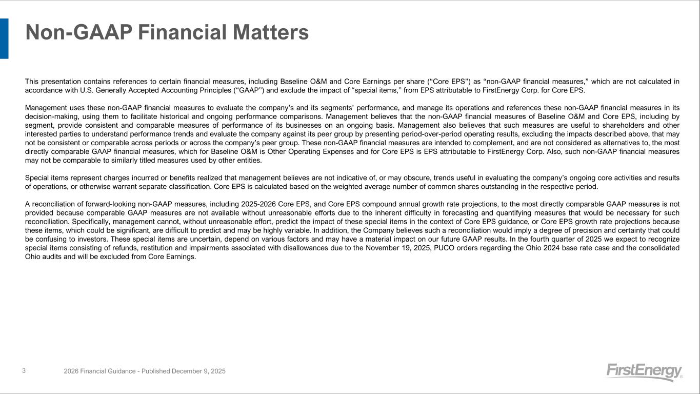 Non-GAAP Financial Matters 3 This presentation contains references to certain financial measures, including Baseline O&M and Core Earnings per share (“Core EPS”) as “non-GAAP financial measures,” which are not calculated in accordance with U.S. Generally Accepted Accounting Principles (“GAAP”) and exclude the impact of “special items,” from EPS attributable to FirstEnergy Corp. for Core EPS. Management uses these non-GAAP financial measures to evaluate the company’s and its segments’ performance, and manage its operations and references these non-GAAP financial measures in its decision-making, using them to facilitate historical and ongoing performance comparisons. Management believes that the non-GAAP financial measures of Baseline O&M and Core EPS, including by segment, provide consistent and comparable measures of performance of its businesses on an ongoing basis. Management also believes that such measures are useful to shareholders and other interested parties to understand performance trends and evaluate the company against its peer group by presenting period-over-period operating results, excluding the impacts described above, that may not be consistent or comparable across periods or across the company’s peer group. These non-GAAP financial measures are intended to complement, and are not considered as alternatives to, the most directly comparable GAAP financial measures, which for Baseline O&M is Other Operating Expenses and for Core EPS is EPS attributable to FirstEnergy Corp. Also, such non-GAAP financial measures may not be comparable to similarly titled measures used by other entities. Special items represent charges incurred or benefits realized that management believes are not indicative of, or may obscure, trends useful in evaluating the company’s ongoing core activities and results of operations, or otherwise warrant separate classification. Core EPS is calculated based on the weighted average number of common shares outstanding in the respective period. A reconciliation of forward-looking non-GAAP measures, including 2025-2026 Core EPS, and Core EPS compound annual growth rate projections, to the most directly comparable GAAP measures is not provided because comparable GAAP measures are not available without unreasonable efforts due to the inherent difficulty in forecasting and quantifying measures that would be necessary for such reconciliation. Specifically, management cannot, without unreasonable effort, predict the impact of these special items in the context of Core EPS guidance, or Core EPS growth rate projections because these items, which could be significant, are difficult to predict and may be highly variable. In addition, the Company believes such a reconciliation would imply a degree of precision and certainty that could be confusing to investors. These special items are uncertain, depend on various factors and may have a material impact on our future GAAP results. In the fourth quarter of 2025 we expect to recognize special items consisting of refunds, restitution and impairments associated with disallowances due to the November 19, 2025, PUCO orders regarding the Ohio 2024 base rate case and the consolidated Ohio audits and will be excluded from Core Earnings. 2026 Financial Guidance - Published December 9, 2025