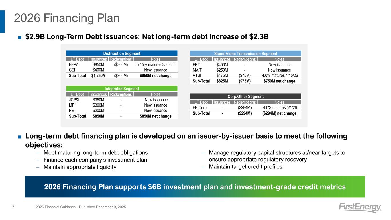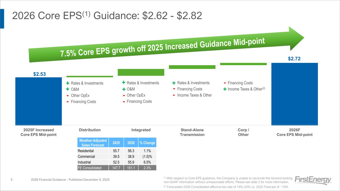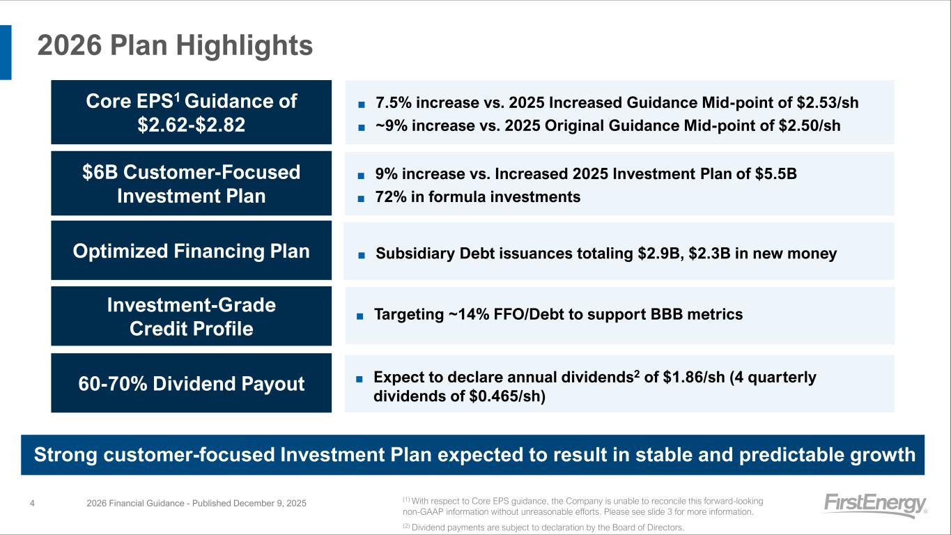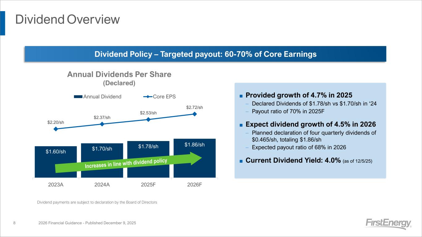 2026 Plan Highlights ■ 7.5% increase vs. 2025 Increased Guidance Mid-point of $2.53/sh ■ ~9% increase vs. 2025 Original Guidance Mid-point of $2.50/sh Core EPS1 Guidance of $2.62-$2.82 $6B Customer-Focused Investment Plan Optimized Financing Plan Investment-Grade Credit Profile 60-70% Dividend Payout Strong customer-focused Investment Plan expected to result in stable and predictable growth ■ 9% increase vs. Increased 2025 Investment Plan of $5.5B ■ 72% in formula investments ■ Subsidiary Debt issuances totaling $2.9B, $2.3B in new money ■ Targeting ~14% FFO/Debt to support BBB metrics ■ Expect to declare annual dividends2 of $1.86/sh (4 quarterly dividends of $0.465/sh) (1) With respect to Core EPS guidance, the Company is unable to reconcile this forward-looking non-GAAP information without unreasonable efforts. Please see slide 3 for more information. (2) Dividend payments are subject to declaration by the Board of Directors. 2026 Financial Guidance - Published December 9, 20254