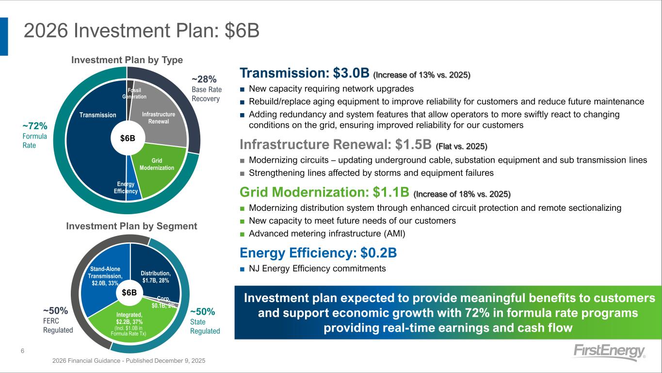2026 Core EPS(1) Guidance: $2.62 - $2.82 5 2025F Increased Core EPS Mid-point Distribution Integrated Stand-Alone Transmission Corp / Other 2026F Core EPS Mid-point $2.72 Rates & Investments O&M Other OpEx Financing Costs Rates & Investments O&M Other OpEx Financing Costs Rates & Investments Financing Costs Income Taxes & Other Financing Costs Income Taxes & Other(2) + + + - - - - - (1) With respect to Core EPS guidance, the Company is unable to reconcile this forward-looking non-GAAP information without unreasonable efforts. Please see slide 3 for more information. (2) Forecasted 2026 Consolidated effective tax rate of 19%-20% vs. 2025 Forecast of ~19% + - ++ - $2.53 Weather-Adjusted Sales Forecast 2025 2026 % Change Residential 55.7 56.3 1.1% Commercial 39.5 38.9 (1.5)% Industrial 52.5 55.9 6.5% FE Consolidated 147.7 151.1 2.3% 2026 Financial Guidance - Published December 9, 2025