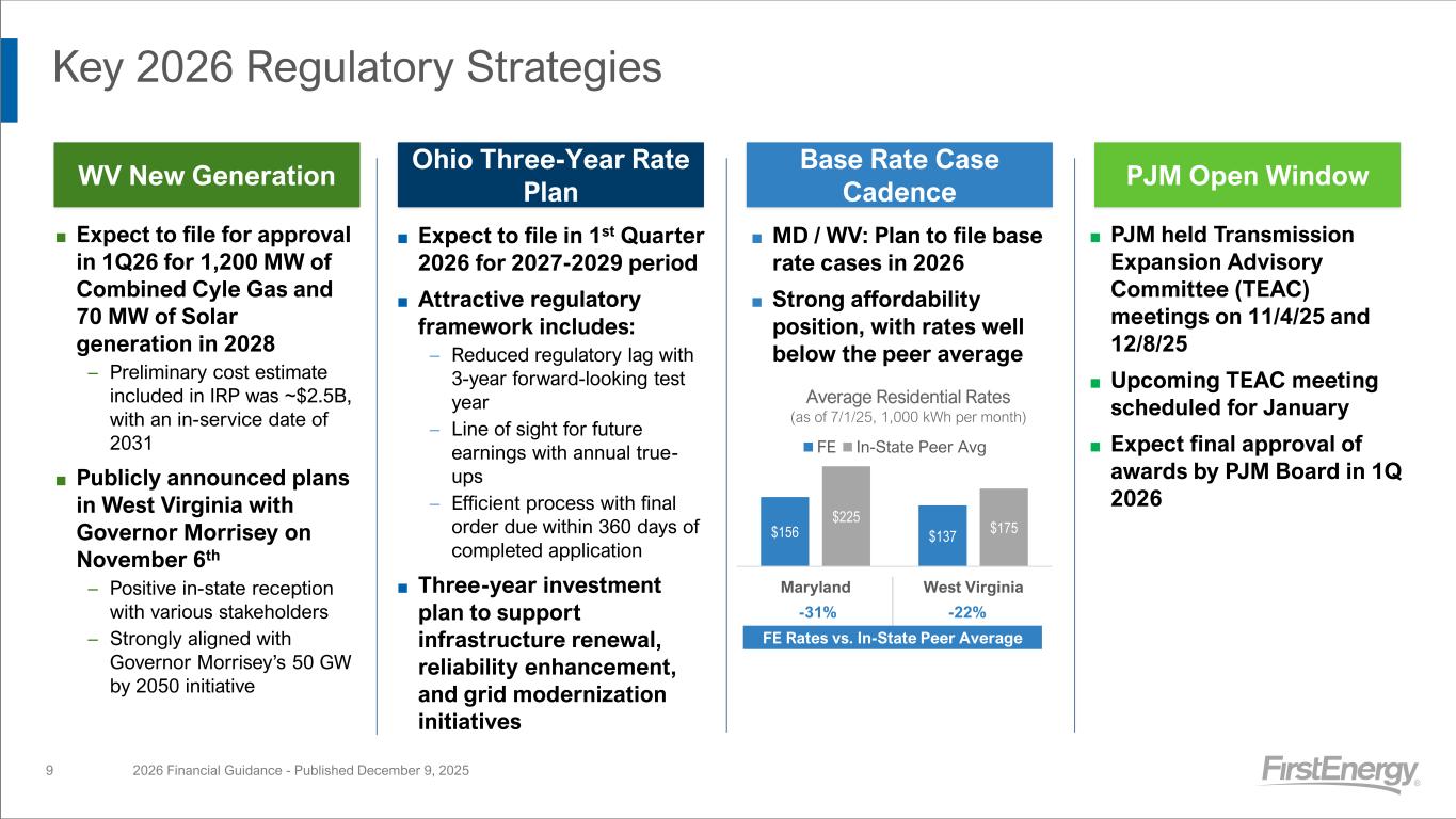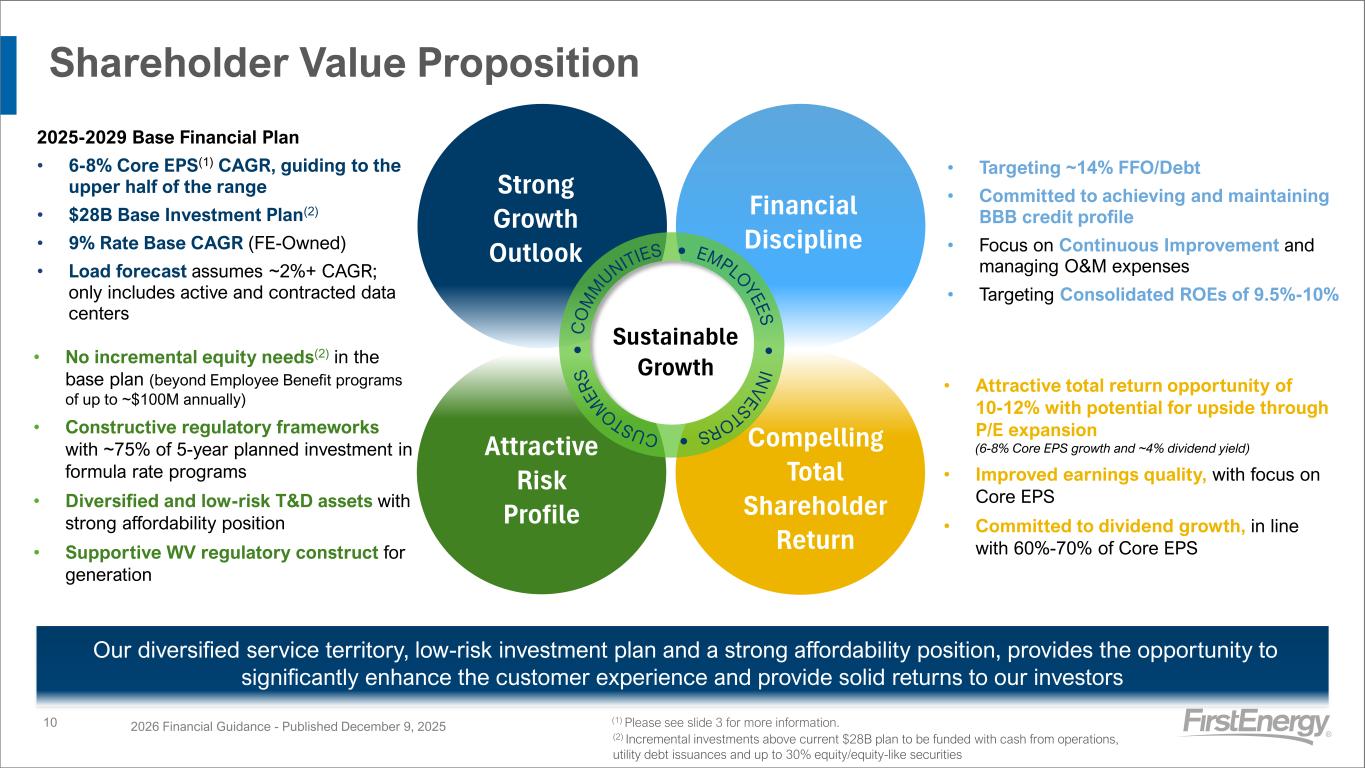 Key 2026 Regulatory Strategies Ohio Three-Year Rate Plan WV New Generation Base Rate Case Cadence ■ Expect to file in 1st Quarter 2026 for 2027-2029 period ■ Attractive regulatory framework includes: – Reduced regulatory lag with 3-year forward-looking test year – Line of sight for future earnings with annual true- ups – Efficient process with final order due within 360 days of completed application ■ Three-year investment plan to support infrastructure renewal, reliability enhancement, and grid modernization initiatives ■ Expect to file for approval in 1Q26 for 1,200 MW of Combined Cyle Gas and 70 MW of Solar generation in 2028 – Preliminary cost estimate included in IRP was ~$2.5B, with an in-service date of 2031 ■ Publicly announced plans in West Virginia with Governor Morrisey on November 6th – Positive in-state reception with various stakeholders – Strongly aligned with Governor Morrisey’s 50 GW by 2050 initiative ■ MD / WV: Plan to file base rate cases in 2026 ■ Strong affordability position, with rates well below the peer average 9 -31% -22% FE Rates vs. In-State Peer Average $156 $137 $225 $175 Maryland West Virginia Average Residential Rates (as of 7/1/25, 1,000 kWh per month) FE In-State Peer Avg 2026 Financial Guidance - Published December 9, 2025 PJM Open Window ■ PJM held Transmission Expansion Advisory Committee (TEAC) meetings on 11/4/25 and 12/8/25 ■ Upcoming TEAC meeting scheduled for January ■ Expect final approval of awards by PJM Board in 1Q 2026