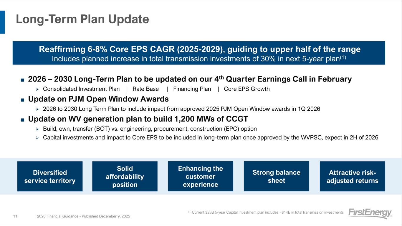 Shareholder Value Proposition 10 (1) Please see slide 3 for more information. • Targeting ~14% FFO/Debt • Committed to achieving and maintaining BBB credit profile • Focus on Continuous Improvement and managing O&M expenses • Targeting Consolidated ROEs of 9.5%-10% • Attractive total return opportunity of 10-12% with potential for upside through P/E expansion (6-8% Core EPS growth and ~4% dividend yield) • Improved earnings quality, with focus on Core EPS • Committed to dividend growth, in line with 60%-70% of Core EPS 2025-2029 Base Financial Plan • 6-8% Core EPS(1) CAGR, guiding to the upper half of the range • $28B Base Investment Plan(2) • 9% Rate Base CAGR (FE-Owned) • Load forecast assumes ~2%+ CAGR; only includes active and contracted data centers • No incremental equity needs(2) in the base plan (beyond Employee Benefit programs of up to ~$100M annually) • Constructive regulatory frameworks with ~75% of 5-year planned investment in formula rate programs • Diversified and low-risk T&D assets with strong affordability position • Supportive WV regulatory construct for generation Financial Discipline Compelling Total Shareholder Return Attractive Risk Profile Strong Growth Outlook Sustainable Growth Our diversified service territory, low-risk investment plan and a strong affordability position, provides the opportunity to significantly enhance the customer experience and provide solid returns to our investors IN V E STORS•CUSTO M E R S • C O M M U NITIES • EMPLO Y E E S • (2) Incremental investments above current $28B plan to be funded with cash from operations, utility debt issuances and up to 30% equity/equity-like securities 2026 Financial Guidance - Published December 9, 2025