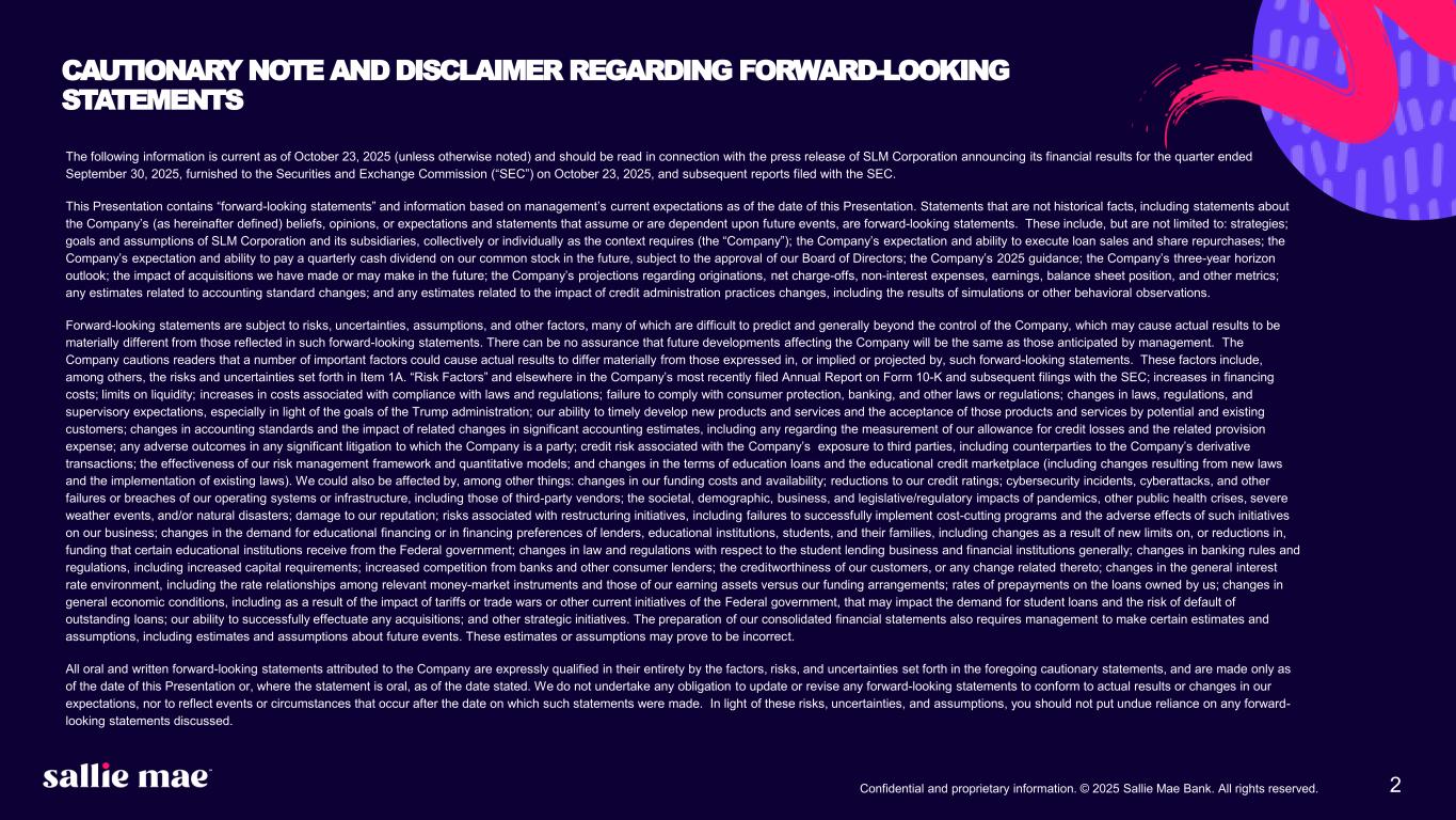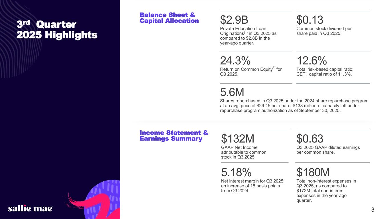 2Confidential and proprietary information. © 2025 Sallie Mae Bank. All rights reserved. The following information is current as of October 23, 2025 (unless otherwise noted) and should be read in connection with the press release of SLM Corporation announcing its financial results for the quarter ended September 30, 2025, furnished to the Securities and Exchange Commission (“SEC”) on October 23, 2025, and subsequent reports filed with the SEC. This Presentation contains “forward-looking statements” and information based on management’s current expectations as of the date of this Presentation. Statements that are not historical facts, including statements about the Company’s (as hereinafter defined) beliefs, opinions, or expectations and statements that assume or are dependent upon future events, are forward-looking statements. These include, but are not limited to: strategies; goals and assumptions of SLM Corporation and its subsidiaries, collectively or individually as the context requires (the “Company”); the Company’s expectation and ability to execute loan sales and share repurchases; the Company’s expectation and ability to pay a quarterly cash dividend on our common stock in the future, subject to the approval of our Board of Directors; the Company’s 2025 guidance; the Company’s three-year horizon outlook; the impact of acquisitions we have made or may make in the future; the Company’s projections regarding originations, net charge-offs, non-interest expenses, earnings, balance sheet position, and other metrics; any estimates related to accounting standard changes; and any estimates related to the impact of credit administration practices changes, including the results of simulations or other behavioral observations. Forward-looking statements are subject to risks, uncertainties, assumptions, and other factors, many of which are difficult to predict and generally beyond the control of the Company, which may cause actual results to be materially different from those reflected in such forward-looking statements. There can be no assurance that future developments affecting the Company will be the same as those anticipated by management. The Company cautions readers that a number of important factors could cause actual results to differ materially from those expressed in, or implied or projected by, such forward-looking statements. These factors include, among others, the risks and uncertainties set forth in Item 1A. “Risk Factors” and elsewhere in the Company’s most recently filed Annual Report on Form 10-K and subsequent filings with the SEC; increases in financing costs; limits on liquidity; increases in costs associated with compliance with laws and regulations; failure to comply with consumer protection, banking, and other laws or regulations; changes in laws, regulations, and supervisory expectations, especially in light of the goals of the Trump administration; our ability to timely develop new products and services and the acceptance of those products and services by potential and existing customers; changes in accounting standards and the impact of related changes in significant accounting estimates, including any regarding the measurement of our allowance for credit losses and the related provision expense; any adverse outcomes in any significant litigation to which the Company is a party; credit risk associated with the Company’s exposure to third parties, including counterparties to the Company’s derivative transactions; the effectiveness of our risk management framework and quantitative models; and changes in the terms of education loans and the educational credit marketplace (including changes resulting from new laws and the implementation of existing laws). We could also be affected by, among other things: changes in our funding costs and availability; reductions to our credit ratings; cybersecurity incidents, cyberattacks, and other failures or breaches of our operating systems or infrastructure, including those of third-party vendors; the societal, demographic, business, and legislative/regulatory impacts of pandemics, other public health crises, severe weather events, and/or natural disasters; damage to our reputation; risks associated with restructuring initiatives, including failures to successfully implement cost-cutting programs and the adverse effects of such initiatives on our business; changes in the demand for educational financing or in financing preferences of lenders, educational institutions, students, and their families, including changes as a result of new limits on, or reductions in, funding that certain educational institutions receive from the Federal government; changes in law and regulations with respect to the student lending business and financial institutions generally; changes in banking rules and regulations, including increased capital requirements; increased competition from banks and other consumer lenders; the creditworthiness of our customers, or any change related thereto; changes in the general interest rate environment, including the rate relationships among relevant money-market instruments and those of our earning assets versus our funding arrangements; rates of prepayments on the loans owned by us; changes in general economic conditions, including as a result of the impact of tariffs or trade wars or other current initiatives of the Federal government, that may impact the demand for student loans and the risk of default of outstanding loans; our ability to successfully effectuate any acquisitions; and other strategic initiatives. The preparation of our consolidated financial statements also requires management to make certain estimates and assumptions, including estimates and assumptions about future events. These estimates or assumptions may prove to be incorrect. All oral and written forward-looking statements attributed to the Company are expressly qualified in their entirety by the factors, ris