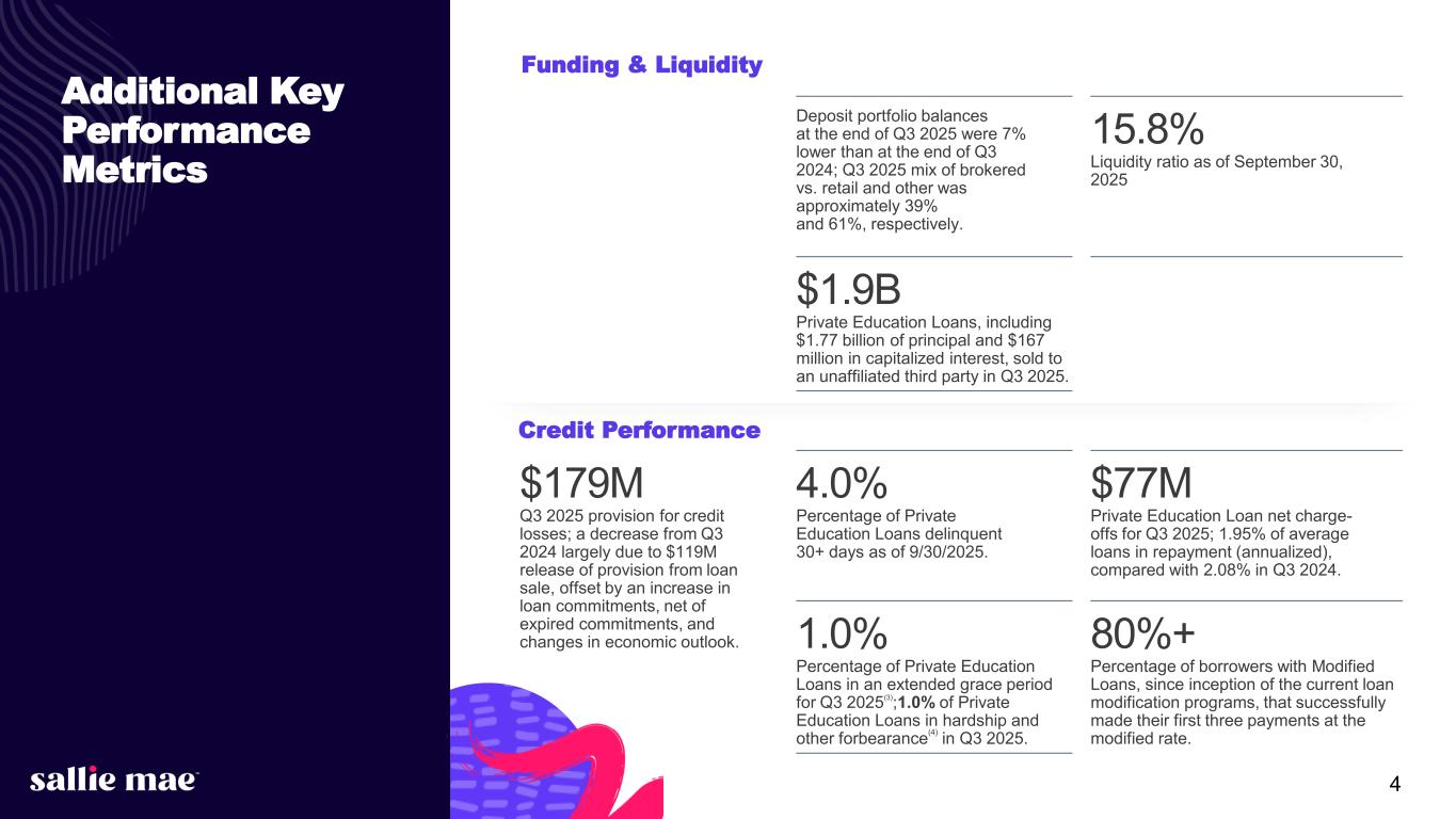 3 $132M GAAP Net Income attributable to common stock in Q3 2025. $0.63 Q3 2025 GAAP diluted earnings per common share. 5.18% Net interest margin for Q3 2025; an increase of 18 basis points from Q3 2024. $180M Total non-interest expenses in Q3 2025, as compared to $172M total non-interest expenses in the year-ago quarter. 3rd Quarter 2025 Highlights $2.9B Private Education Loan Originations(1) in Q3 2025 as compared to $2.8B in the year-ago quarter. $0.13 Common stock dividend per share paid in Q3 2025. 24.3% Return on Common Equity (2) for Q3 2025. 12.6% Total risk-based capital ratio; CET1 capital ratio of 11.3%. 5.6M Shares repurchased in Q3 2025 under the 2024 share repurchase program at an avg. price of $29.45 per share; $138 million of capacity left under repurchase program authorization as of September 30, 2025. Balance Sheet & Capital Allocation Income Statement & Earnings Summary