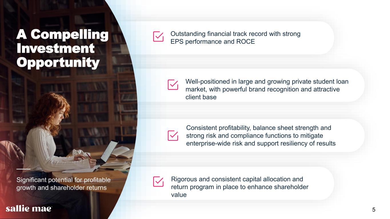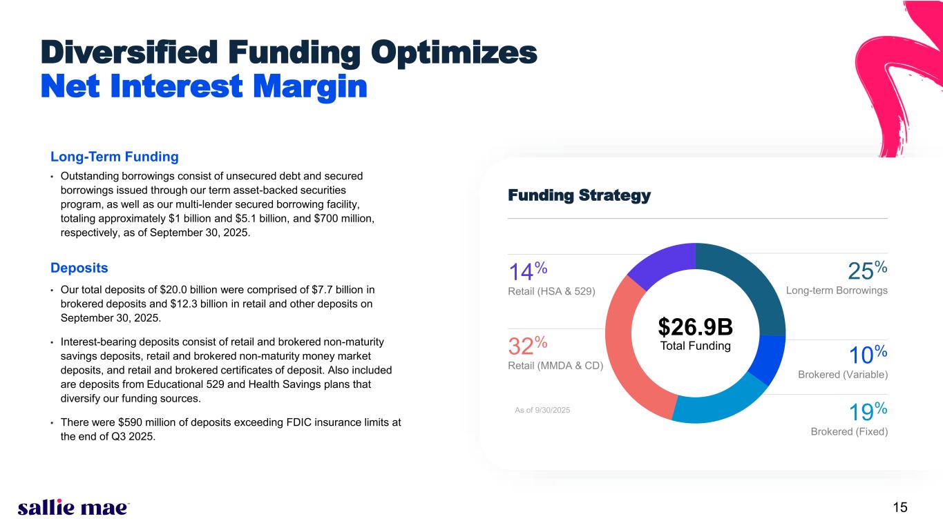 4 $179M Q3 2025 provision for credit losses; a decrease from Q3 2024 largely due to $119M release of provision from loan sale, offset by an increase in loan commitments, net of expired commitments, and changes in economic outlook. 4.0% Percentage of Private Education Loans delinquent 30+ days as of 9/30/2025. $77M Private Education Loan net charge- offs for Q3 2025; 1.95% of average loans in repayment (annualized), compared with 2.08% in Q3 2024. 1.0% Percentage of Private Education Loans in an extended grace period for Q3 2025 (3) ;1.0% of Private Education Loans in hardship and other forbearance (4) in Q3 2025. 80%+ Percentage of borrowers with Modified Loans, since inception of the current loan modification programs, that successfully made their first three payments at the modified rate. Additional Key Performance Metrics Credit Performance Funding & Liquidity Deposit portfolio balances at the end of Q3 2025 were 7% lower than at the end of Q3 2024; Q3 2025 mix of brokered vs. retail and other was approximately 39% and 61%, respectively. 15.8% Liquidity ratio as of September 30, 2025 $1.9B Private Education Loans, including $1.77 billion of principal and $167 million in capitalized interest, sold to an unaffiliated third party in Q3 2025.