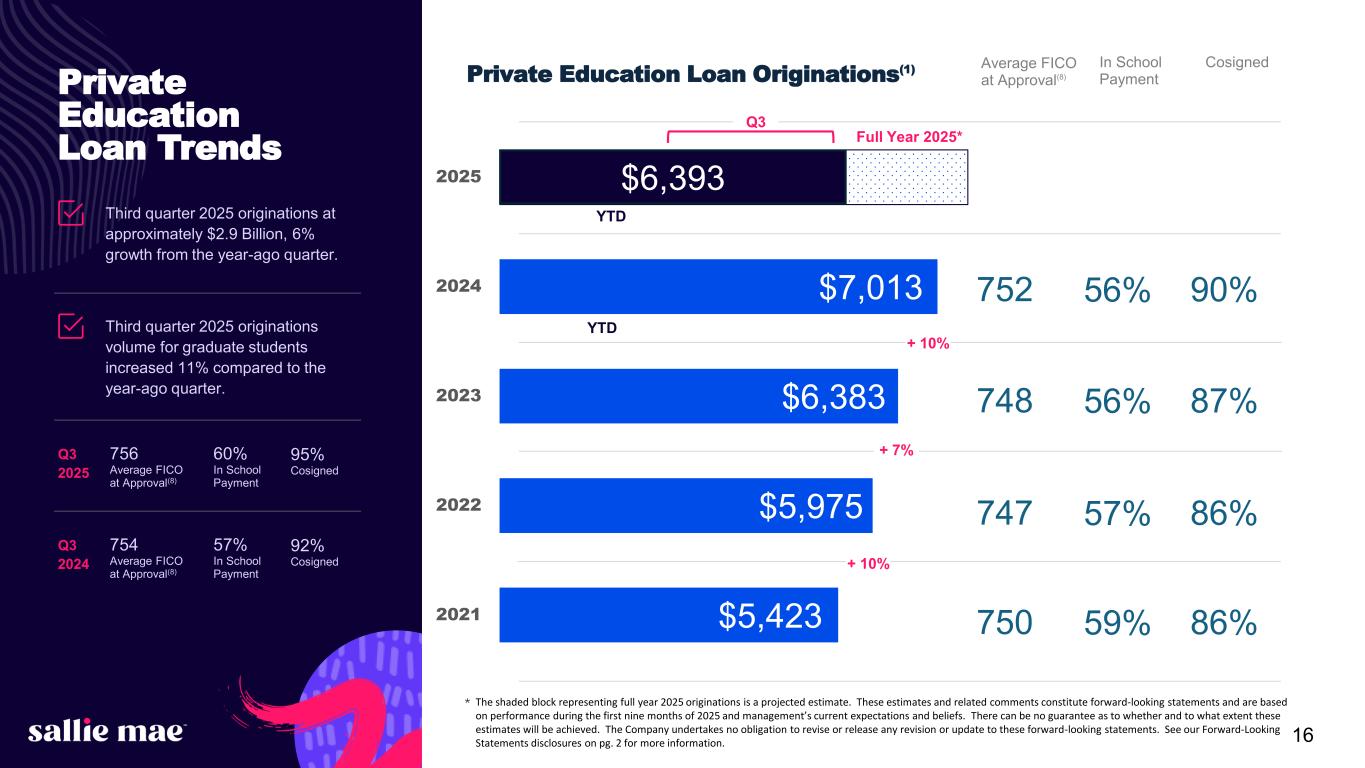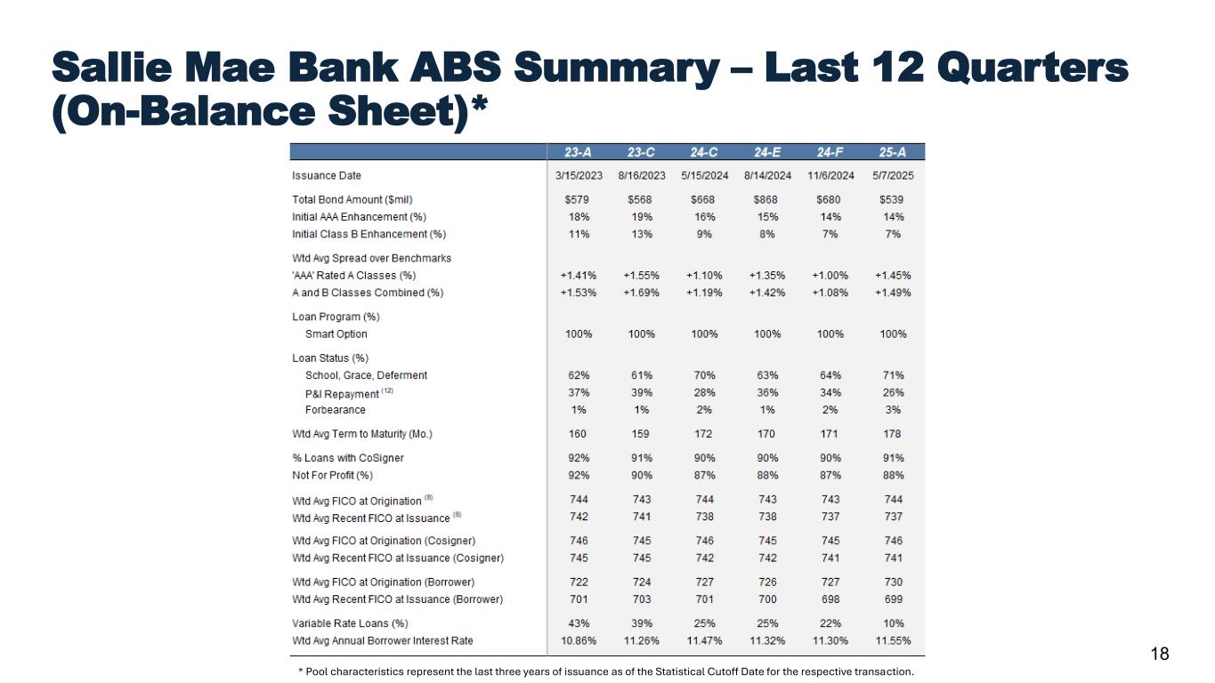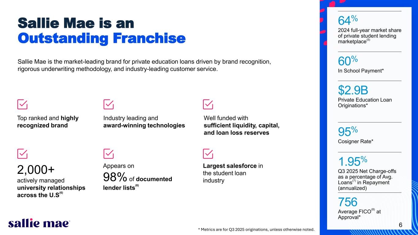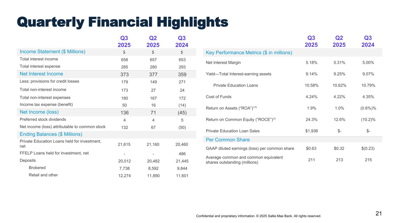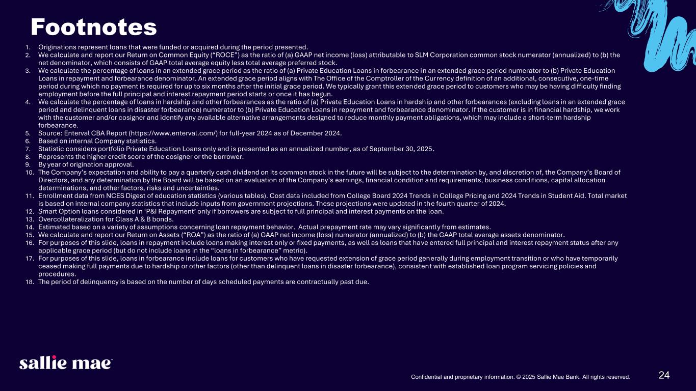 24Confidential and proprietary information. © 2025 Sallie Mae Bank. All rights reserved. 1. Originations represent loans that were funded or acquired during the period presented. 2. We calculate and report our Return on Common Equity (“ROCE”) as the ratio of (a) GAAP net income (loss) attributable to SLM Corporation common stock numerator (annualized) to (b) the net denominator, which consists of GAAP total average equity less total average preferred stock. 3. We calculate the percentage of loans in an extended grace period as the ratio of (a) Private Education Loans in forbearance in an extended grace period numerator to (b) Private Education Loans in repayment and forbearance denominator. An extended grace period aligns with The Office of the Comptroller of the Currency definition of an additional, consecutive, one-time period during which no payment is required for up to six months after the initial grace period. We typically grant this extended grace period to customers who may be having difficulty finding employment before the full principal and interest repayment period starts or once it has begun. 4. We calculate the percentage of loans in hardship and other forbearances as the ratio of (a) Private Education Loans in hardship and other forbearances (excluding loans in an extended grace period and delinquent loans in disaster forbearance) numerator to (b) Private Education Loans in repayment and forbearance denominator. If the customer is in financial hardship, we work with the customer and/or cosigner and identify any available alternative arrangements designed to reduce monthly payment obligations, which may include a short-term hardship forbearance. 5. Source: Enterval CBA Report (https://www.enterval.com/) for full-year 2024 as of December 2024. 6. Based on internal Company statistics. 7. Statistic considers portfolio Private Education Loans only and is presented as an annualized number, as of September 30, 2025. 8. Represents the higher credit score of the cosigner or the borrower. 9. By year of origination approval. 10. The Company’s expectation and ability to pay a quarterly cash dividend on its common stock in the future will be subject to the determination by, and discretion of, the Company’s Board of Directors, and any determination by the Board will be based on an evaluation of the Company’s earnings, financial condition and requirements, business conditions, capital allocation determinations, and other factors, risks and uncertainties. 11. Enrollment data from NCES Digest of education statistics (various tables). Cost data included from College Board 2024 Trends in College Pricing and 2024 Trends in Student Aid. Total market is based on internal company statistics that include inputs from government projections. These projections were updated in the fourth quarter of 2024. 12. Smart Option loans considered in ‘P&I Repayment’ only if borrowers are subject to full principal and interest payments on the loan. 13. Overcollateralization for Class A & B bonds. 14. Estimated based on a variety of assumptions concerning loan repayment behavior. Actual prepayment rate may vary significantly from estimates. 15. We calculate and report our Return on Assets (“ROA”) as the ratio of (a) GAAP net income (loss) numerator (annualized) to (b) the GAAP total average assets denominator. 16. For purposes of this slide, loans in repayment include loans making interest only or fixed payments, as well as loans that have entered full principal and interest repayment status after any applicable grace period (but do not include loans in the “loans in forbearance” metric). 17. For purposes of this slide, loans in forbearance include loans for customers who have requested extension of grace period generally during employment transition or who have temporarily ceased making full payments due to hardship or other factors (other than delinquent loans in disaster forbearance), consistent with established loan program servicing policies and procedures. 18. The period of delinquency is based on the number of days scheduled payments are contractually past due. Footnotes