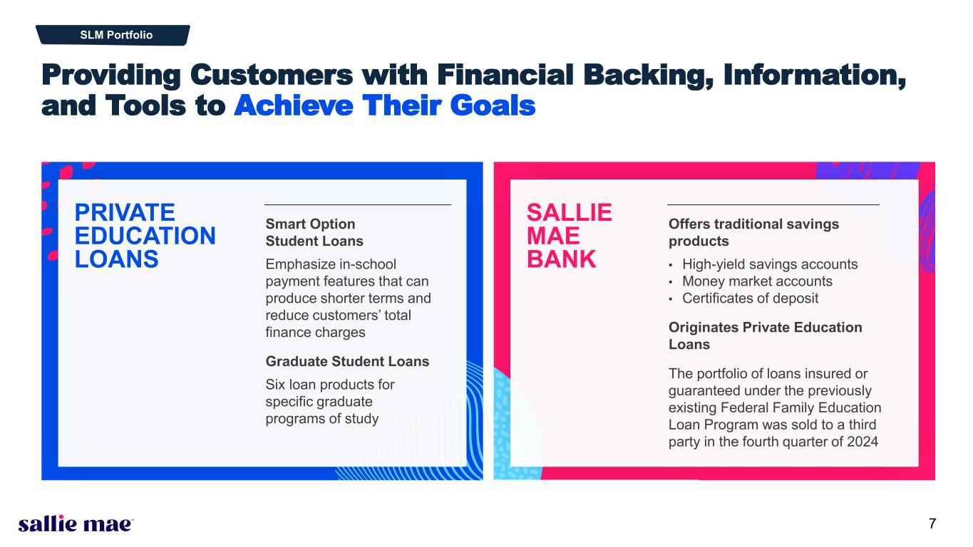 6 64% 2024 full-year market share of private student lending marketplace (5) 60% In School Payment* $2.9B Private Education Loan Originations* 95% Cosigner Rate* 1.95% Q3 2025 Net Charge-offs as a percentage of Avg. Loans (7) in Repayment (annualized) 756 Average FICO (8) at Approval* Top ranked and highly recognized brand Industry leading and award-winning technologies Well funded with sufficient liquidity, capital, and loan loss reserves Sallie Mae is the market-leading brand for private education loans driven by brand recognition, rigorous underwriting methodology, and industry-leading customer service. 2,000+ actively managed university relationships across the U.S (6) Appears on 98% of documented lender lists (6) Largest salesforce in the student loan industry Sallie Mae is an Outstanding Franchise * Metrics are for Q3 2025 originations, unless otherwise noted.