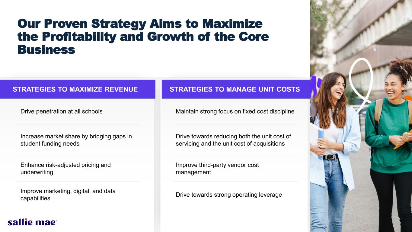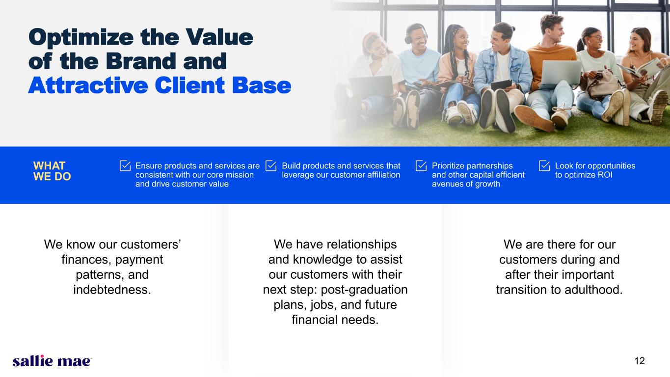 11 STRATEGIES TO MAXIMIZE REVENUE STRATEGIES TO MANAGE UNIT COSTS Our Proven Strategy Aims to Maximize the Profitability and Growth of the Core Business Drive penetration at all schools Increase market share by bridging gaps in student funding needs Enhance risk-adjusted pricing and underwriting Improve marketing, digital, and data capabilities Maintain strong focus on fixed cost discipline Drive towards reducing both the unit cost of servicing and the unit cost of acquisitions Improve third-party vendor cost management Drive towards strong operating leverage