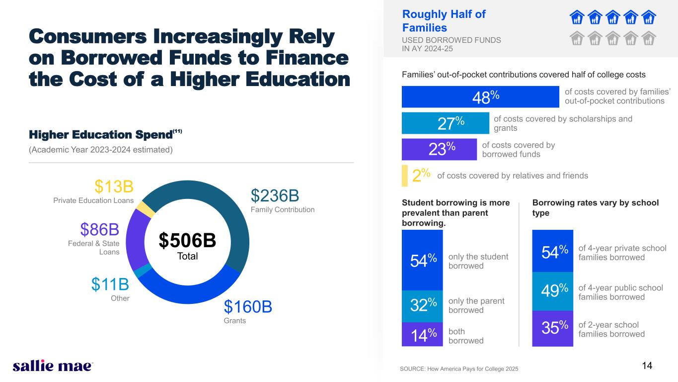 10 More Personalized, Flexible Financing Options that Set Students Up for Success WE BELIEVE WE ARE WELL POSITIONED TO CAPTURE MARKET SHARE THROUGH COMPELLING OFFERINGS Sallie Mae Federal Student Loan Program U n d e rg ra d u a te Loan Program Smart Option Student Loan Federal Direct Loan (Subsidized & Unsubsidized) Parent Plus Loan Limits $1,000 - Cost of Attendance No aggregate limits Yr. 1 - $5,500 ($3,500 > subsidized) Yr. 2 - $6,500 ($4,500 > subsidized) Yr. 3+ - $7,500 ($5,500 > subsidized) $31,000 Aggregate ($23,000 > subsidized) No Limit Interest Rates (as of 9/30/25) Variable: S + 0.250% - S + 13.670% Fixed: 3.200% - 18.550% 6.390% 8.940% Origination Fees (as of 9/30/25) 0% 1.057% 4.228% Repayment Types IO / Fixed Pay / Deferred Deferred Immediate P&I / Deferred Repayment Terms 10 - 15 Years 10 Years (extended repayment 20 or 25 years) 10 Years (extended repayment 20 or 25 years) G ra d u a te Loan Program Graduate Product Suite (MBA, Medical, Dental, Law, Health Professions, General Grad) Federal Direct Loan (Unsubsidized only) Graduate Plus Loan Limits $1,000 - Cost of Attendance No aggregate limits $20,500 Per Year $138,500 Aggregate ($65,000 > subsidized - including undergraduate subsidized only) No Limit Interest Rates (as of 9/30/25) Variable: S + 0.250% - S + 10.125% Fixed: 3.200% - 15.520% 7.940% 8.940% Origination Fees (as of 9/30/25) 0% 1.057% 4.228% Repayment Types IO / Fixed Pay / Deferred Deferred Immediate P&I / Deferred Repayment Terms 10-15 Years - HP, General Grad, Law 5 – 15 Years - MBA 20 Years - Medical & Dental 10 Years (extended repayment 20 or 25 years) 10 Years (extended repayment 20 or 25 years) Products designed to meet the needs of all students Developing unique and innovative products to diversify portfolio Medical General Studies Dental Health Professions MBA Undergraduate Law