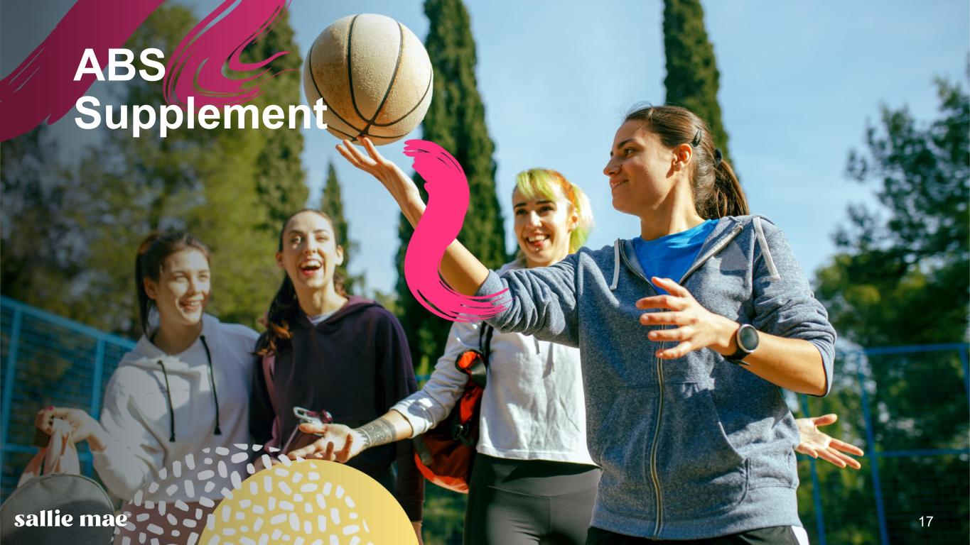 16 Confidential and proprietary information. © 2025 Sallie Mae Bank. All rights reserved. $5,423 $5,975 $6,383 $7,013 2021 2022 2023 2024 2025 87%748 56% 86%747 57% 86%750 59% Private Education Loan Trends Third quarter 2025 originations at approximately $2.9 Billion, 6% growth from the year-ago quarter. Third quarter 2025 originations volume for graduate students increased 11% compared to the year-ago quarter. Average FICO at Approval(8) In School Payment Cosigned Private Education Loan Originations(1) + 7% + 10% 756 Average FICO at Approval(8) 60% In School Payment 95% Cosigned Q3 2025 754 Average FICO at Approval(8) 57% In School Payment 92% Cosigned Q3 2024 + 10% * $6,393 YTD Full Year 2025* YTD 90%752 56% * The shaded block representing full year 2025 originations is a projected estimate. These estimates and related comments constitute forward-looking statements and are based on performance during the first nine months of 2025 and management’s current expectations and beliefs. There can be no guarantee as to whether and to what extent these estimates will be achieved. The Company undertakes no obligation to revise or release any revision or update to these forward-looking statements. See our Forward-Looking Statements disclosures on pg. 2 for more information. Q3