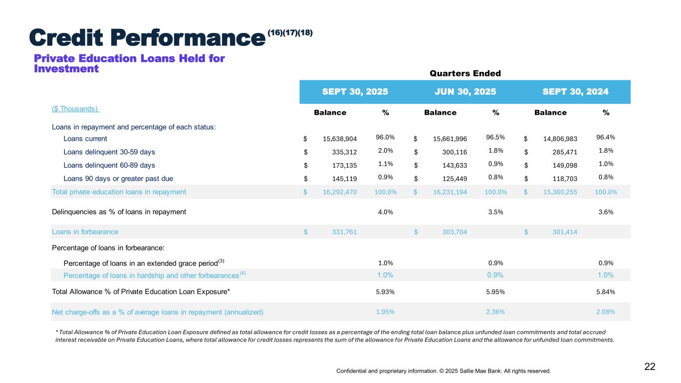 21 Confidential and proprietary information. © 2025 Sallie Mae Bank. All rights reserved. Q3 2025 Q2 2025 Q3 2024 Income Statement ($ Millions) $ $ $ Total interest income 658 657 653 Total interest expense 285 280 293 Net Interest Income 373 377 359 Less: provisions for credit losses 179 149 271 Total non-interest income 173 27 24 Total non-interest expenses 180 167 172 Income tax expense (benefit) 50 16 (14) Net Income (loss) 136 71 (45) Preferred stock dividends 4 4 5 Net income (loss) attributable to common stock 132 67 (50) Ending Balances ($ Millions) Private Education Loans held for investment, net 21,615 21,160 20,460 FFELP Loans held for investment, net - - 486 Deposits 20,012 20,482 21,445 Brokered 7,738 8,592 9,844 Retail and other 12,274 11,890 11,601 Q3 2025 Q2 2025 Q3 2024 Key Performance Metrics ($ in millions) Net Interest Margin 5.18% 5.31% 5.00% Yield—Total Interest-earning assets 9.14% 9.25% 9.07% Private Education Loans 10.58% 10.62% 10.79% Cost of Funds 4.24% 4.22% 4.35% Return on Assets (“ROA”)(15) 1.9% 1.0% (0.6%)% Return on Common Equity (“ROCE”)(2) 24.3% 12.6% (10.2)% Private Education Loan Sales $1,936 $- $- Per Common Share GAAP diluted earnings (loss) per common share $0.63 $0.32 $(0.23) Average common and common equivalent shares outstanding (millions) 211 213 215 Quarterly Financial Highlights