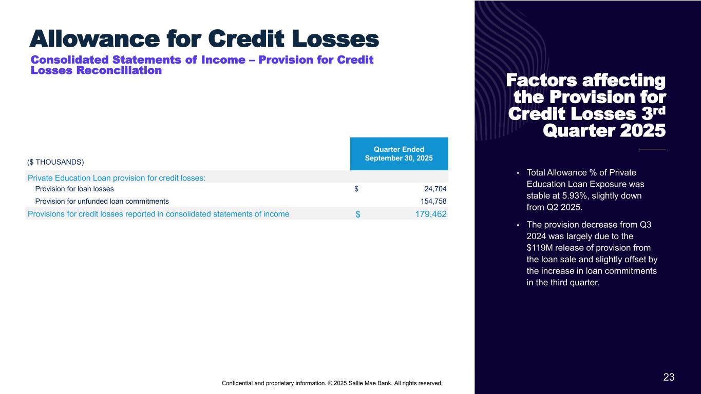 22 Confidential and proprietary information. © 2025 Sallie Mae Bank. All rights reserved. Credit Performance (16)(17)(18) Private Education Loans Held for Investment * Total Allowance % of Private Education Loan Exposure defined as total allowance for credit losses as a percentage of the ending total loan balance plus unfunded loan commitments and total accrued interest receivable on Private Education Loans, where total allowance for credit losses represents the sum of the allowance for Private Education Loans and the allowance for unfunded loan commitments. ($ Thousands) Balance % Balance % Balance % Loans in repayment and percentage of each status: Loans current 15,638,904$ 96.0% 15,661,996$ 96.5% 14,806,983$ 96.4% Loans delinquent 30-59 days 335,312$ 2.0% 300,116$ 1.8% 285,471$ 1.8% Loans delinquent 60-89 days 173,135$ 1.1% 143,633$ 0.9% 149,098$ 1.0% Loans 90 days or greater past due 145,119$ 0.9% 125,449$ 0.8% 118,703$ 0.8% Total private education loans in repayment 16,292,470$ 100.0% 16,231,194$ 100.0% 15,360,255$ 100.0% Delinquencies as % of loans in repayment 4.0% 3.5% 3.6% Loans in forbearance 331,761$ 303,704$ 301,414$ Percentage of loans in forbearance: Percentage of loans in an extended grace period(3) 1.0% 0.9% 0.9% Percentage of loans in hardship and other forbearances (4) 1.0% 0.9% 1.0% 5.93% 5.95% 5.84% Net charge-offs as a % of average loans in repayment (annualized) 1.95% 2.36% 2.08% Total Allowance % of Private Education Loan Exposure* SEPT 30, 2024 Quarters Ended SEPT 30, 2025 JUN 30, 2025
