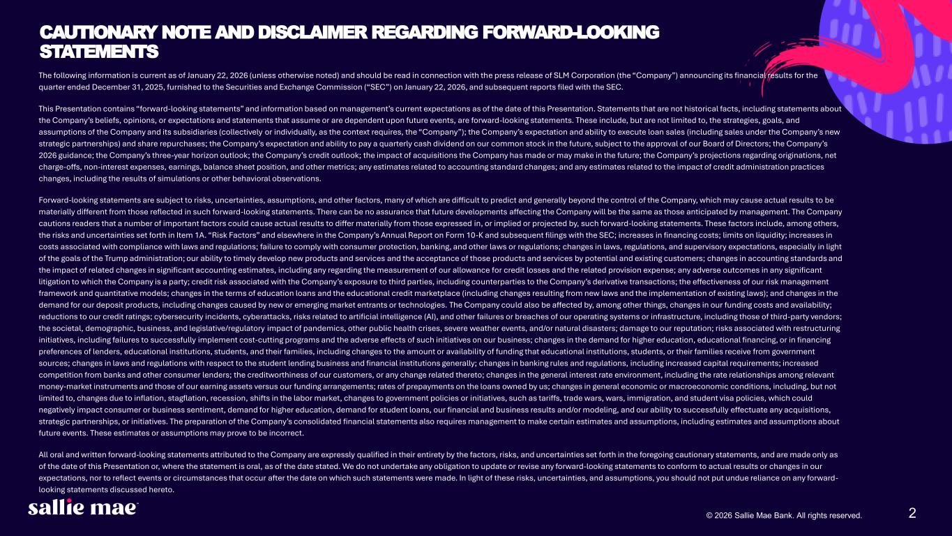 2© 2026 Sallie Mae Bank. All rights reserved. The following information is current as of January 22, 2026 (unless otherwise noted) and should be read in connection with the press release of SLM Corporation (the “Company”) announcing its financial results for the quarter ended December 31, 2025, furnished to the Securities and Exchange Commission (“SEC”) on January 22, 2026, and subsequent reports filed with the SEC. This Presentation contains “forward-looking statements” and information based on management’s current expectations as of the date of this Presentation. Statements that are not historical facts, including statements about the Company’s beliefs, opinions, or expectations and statements that assume or are dependent upon future events, are forward-looking statements. These include, but are not limited to, the strategies, goals, and assumptions of the Company and its subsidiaries (collectively or individually, as the context requires, the “Company”); the Company’s expectation and ability to execute loan sales (including sales under the Company’s new strategic partnerships) and share repurchases; the Company’s expectation and ability to pay a quarterly cash dividend on our common stock in the future, subject to the approval of our Board of Directors; the Company’s 2026 guidance; the Company’s three-year horizon outlook; the Company’s credit outlook; the impact of acquisitions the Company has made or may make in the future; the Company’s projections regarding originations, net charge-offs, non-interest expenses, earnings, balance sheet position, and other metrics; any estimates related to accounting standard changes; and any estimates related to the impact of credit administration practices changes, including the results of simulations or other behavioral observations. Forward-looking statements are subject to risks, uncertainties, assumptions, and other factors, many of which are difficult to predict and generally beyond the control of the Company, which may cause actual results to be materially different from those reflected in such forward-looking statements. There can be no assurance that future developments affecting the Company will be the same as those anticipated by management. The Company cautions readers that a number of important factors could cause actual results to differ materially from those expressed in, or implied or projected by, such forward-looking statements. These factors include, among others, the risks and uncertainties set forth in Item 1A. “Risk Factors” and elsewhere in the Company’s Annual Report on Form 10-K and subsequent filings with the SEC; increases in financing costs; limits on liquidity; increases in costs associated with compliance with laws and regulations; failure to comply with consumer protection, banking, and other laws or regulations; changes in laws, regulations, and supervisory expectations, especially in light of the goals of the Trump administration; our ability to timely develop new products and services and the acceptance of those products and services by potential and existing customers; changes in accounting standards and the impact of related changes in significant accounting estimates, including any regarding the measurement of our allowance for credit losses and the related provision expense; any adverse outcomes in any significant litigation to which the Company is a party; credit risk associated with the Company’s exposure to third parties, including counterparties to the Company’s derivative transactions; the effectiveness of our risk management framework and quantitative models; changes in the terms of education loans and the educational credit marketplace (including changes resulting from new laws and the implementation of existing laws); and changes in the demand for our deposit products, including changes caused by new or emerging market entrants or technologies. The Company could also be affected by, among other things, changes in our funding costs and availability; reductions to our credit ratings; cybersecurity incidents, cyberattacks, risks related to artificial intelligence (AI), and other failures or breaches of our operating systems or infrastructure, including those of third-party vendors; the societal, demographic, business, and legislative/regulatory impact of pandemics, other public health crises, severe weather events, and/or natural disasters; damage to our reputation; risks associated with restructuring initiatives, including failures to successfully implement cost-cutting programs and the adverse effects of such initiatives on our business; changes in the demand for higher education, educational financing, or in financing preferences of lenders, educational institutions, students, and their families, including changes to the amount or availability of funding that educational institutions, students, or their families receive from government sources; changes in laws and regulations with respect to the student lending business and financial institutions generally; changes in banking rules and regulations, including increased capital requirements; increased competition from banks and other consumer lenders; the creditworthiness of our customers, or any change related thereto; changes in the general interest rate environment, including the rate relationships among relevant money-market instruments and those of our earning assets versus our funding arrangements; rates of prepayments on the loans owned by us; changes in general economic or macroeconomic conditions, including, but not limited to, changes due to inflation, stagflation, recession, shifts in the labor market, changes to government policies or initiatives, such as tariffs, trade wars, wars, immigration, and student visa policies, which could negatively impact consumer or business sentiment, demand for higher education, demand for student loans, our financial and business results and/or modeling, and our abili