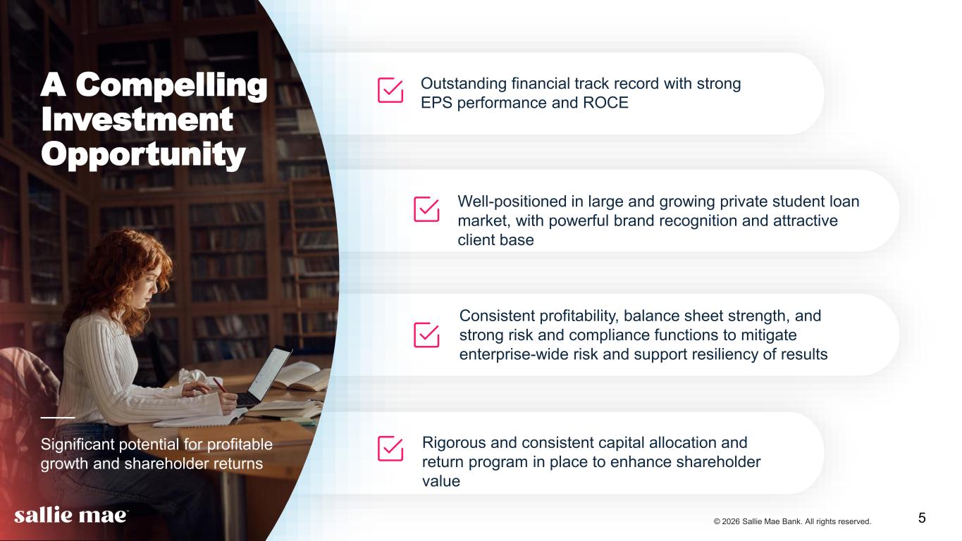 4© 2026 Sallie Mae Bank. All rights reserved. ($19M) Q4 2025 provision for credit losses; compared with $108M in provisions in Q4 2024. 4.0% Percentage of Private Education Loans in repayment delinquent 30+ days as of 12/31/2025, as compared to 3.7% as of 12/31/2024. $346M Private Education Loan net charge- offs for Full-Year 2025; 2.15% of average Private Education Loans in repayment at 12/31/2025, compared with 2.19% at 12/31/2024. 1.7% Percentage of Private Education Loans in an extended grace period for Q4 2025 (1) ; 1.0% of Private Education Loans in hardship and other forbearances in Q4 2025 (2) . $98M Private Education Loan net charge-offs for Q4 2025; 2.42% of average loans in repayment (annualized), compared with 2.38% in Q4 2024. Additional Key Performance Metrics Credit Performance $229M GAAP net income attributable to common stock in Q4 2025. $1.12 Q4 2025 GAAP diluted earnings per common share. $3.46 Full-Year 2025 GAAP diluted earnings per common share. $729M GAAP net income attributable to common stock in Full-Year 2025. 5.24% Net interest margin for Full-Year 2025 and 5.21% net interest margin for Q4 2025. $659M Total non-interest expenses in Full- Year 2025, as compared to $642M for 2024. $157M total non-interest expenses in Q4 2025, as compared to $150M in Q4 2024. 33.2% Efficiency Ratio for Full-Year 2025; calculated as Non-Interest Expenses over Net Interest Income and Non- Interest Income. Income Statement & Earnings Summary