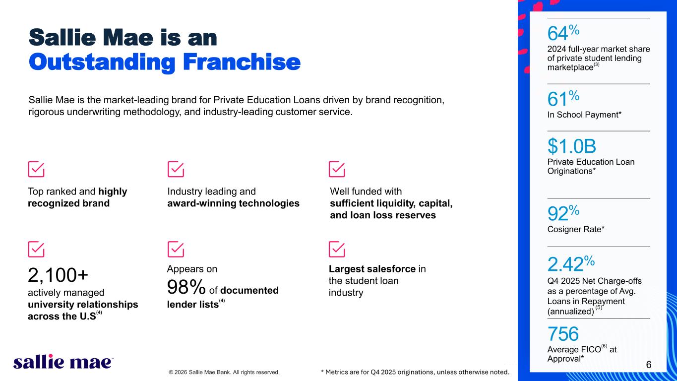 5© 2026 Sallie Mae Bank. All rights reserved. Outstanding financial track record with strong EPS performance and ROCE Well-positioned in large and growing private student loan market, with powerful brand recognition and attractive client base Consistent profitability, balance sheet strength, and strong risk and compliance functions to mitigate enterprise-wide risk and support resiliency of results Rigorous and consistent capital allocation and return program in place to enhance shareholder value A Compelling Investment Opportunity Significant potential for profitable growth and shareholder returns