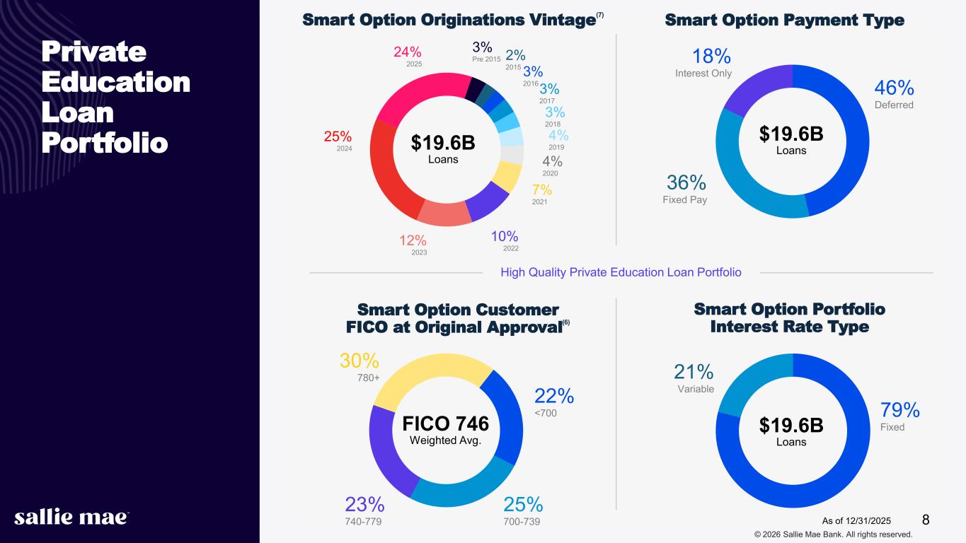 7© 2026 Sallie Mae Bank. All rights reserved. Providing Customers with Financial Backing, Information, and Tools to Achieve Their Goals SALLIE MAE BANK Offers traditional savings products • High-yield savings accounts • Money market accounts • Certificates of deposit Originates Private Education Loans The portfolio of loans insured or guaranteed under the previously existing Federal Family Education Loan Program was sold to a third party in the fourth quarter of 2024 PRIVATE EDUCATION LOANS Smart Option Student Loans Emphasize in-school payment features that can produce shorter terms and reduce customers’ total finance charges Graduate Student Loans Six loan products for specific graduate programs of study SLM Portfolio