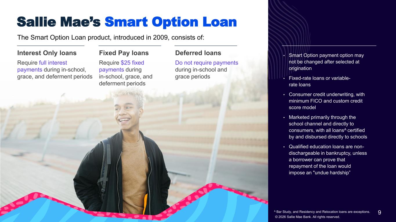 8© 2026 Sallie Mae Bank. All rights reserved. Private Education Loan Portfolio High Quality Private Education Loan Portfolio $19.6B Loans 21% Variable 79% Fixed Smart Option Portfolio Interest Rate Type 46% Deferred 36% Fixed Pay 18% Interest Only $19.6B Loans Smart Option Customer FICO at Original Approval (6) 30% 780+ 22% <700 25% 700-739 23% 740-779 FICO 746 Weighted Avg. 25% 2024 3% Pre 2015 2% 2015 3% 2016 3% 2017 3% 2018 4% 2019 4% 2020 7% 2021 10% 2022 12% 2023 $19.6B Loans As of 12/31/2025 24% 2025 Smart Option Originations Vintage (7) Smart Option Payment Type © 2026 Sallie Mae Bank. All rights reserved.