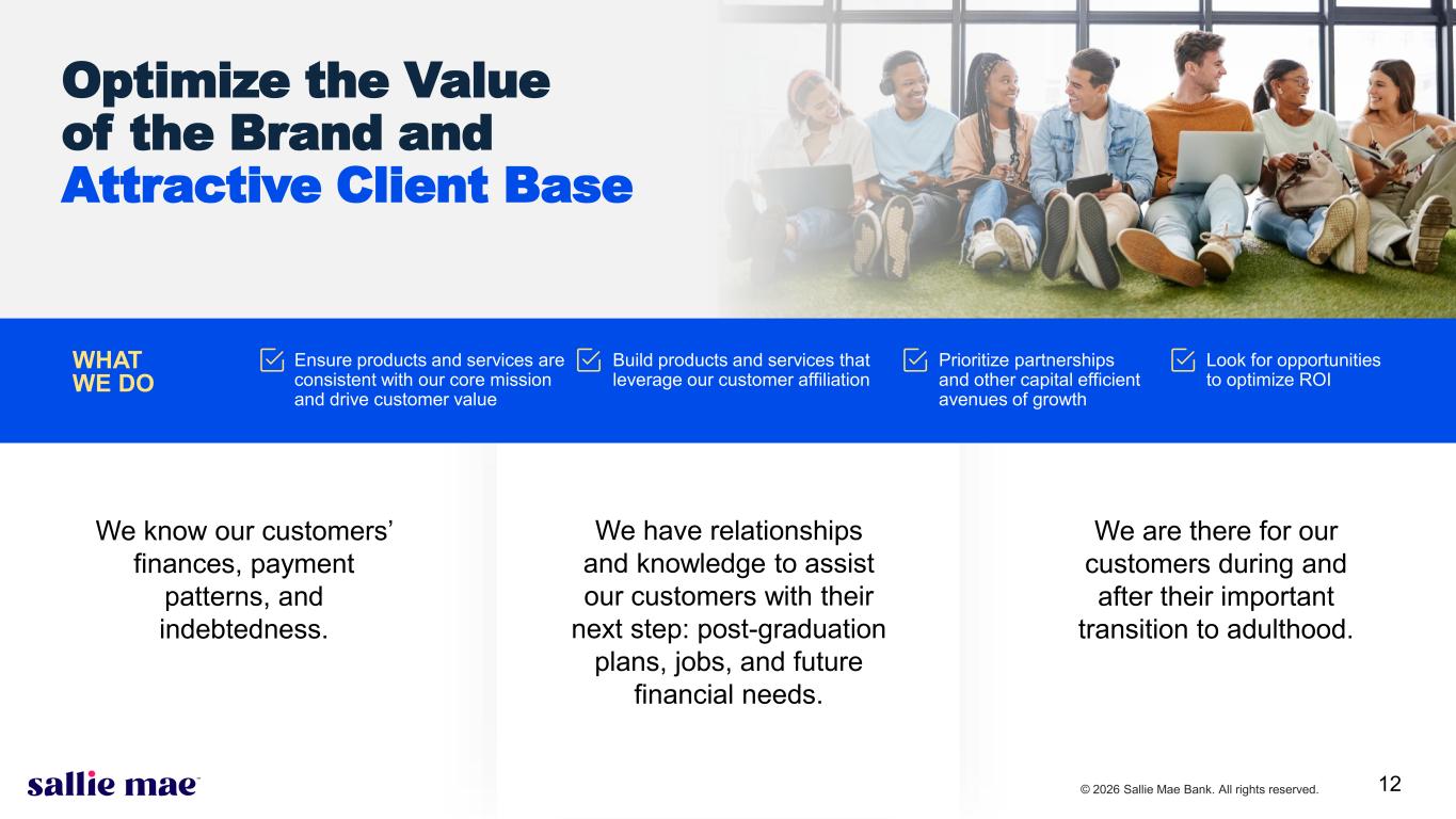11© 2026 Sallie Mae Bank. All rights reserved. STRATEGIES TO MAXIMIZE REVENUE STRATEGIES TO MANAGE UNIT COSTS Our Proven Strategy Aims to Maximize the Profitability and Growth of the Core Business Drive penetration at all schools Increase market share by bridging gaps in student funding needs Enhance risk-adjusted pricing and underwriting Improve marketing, digital, and data capabilities Maintain strong focus on fixed cost discipline Drive towards reducing both the unit cost of servicing and the unit cost of acquisitions Improve third-party vendor cost management Drive towards strong operating leverage © 2026 Sallie Mae Bank. All rights reserved.
