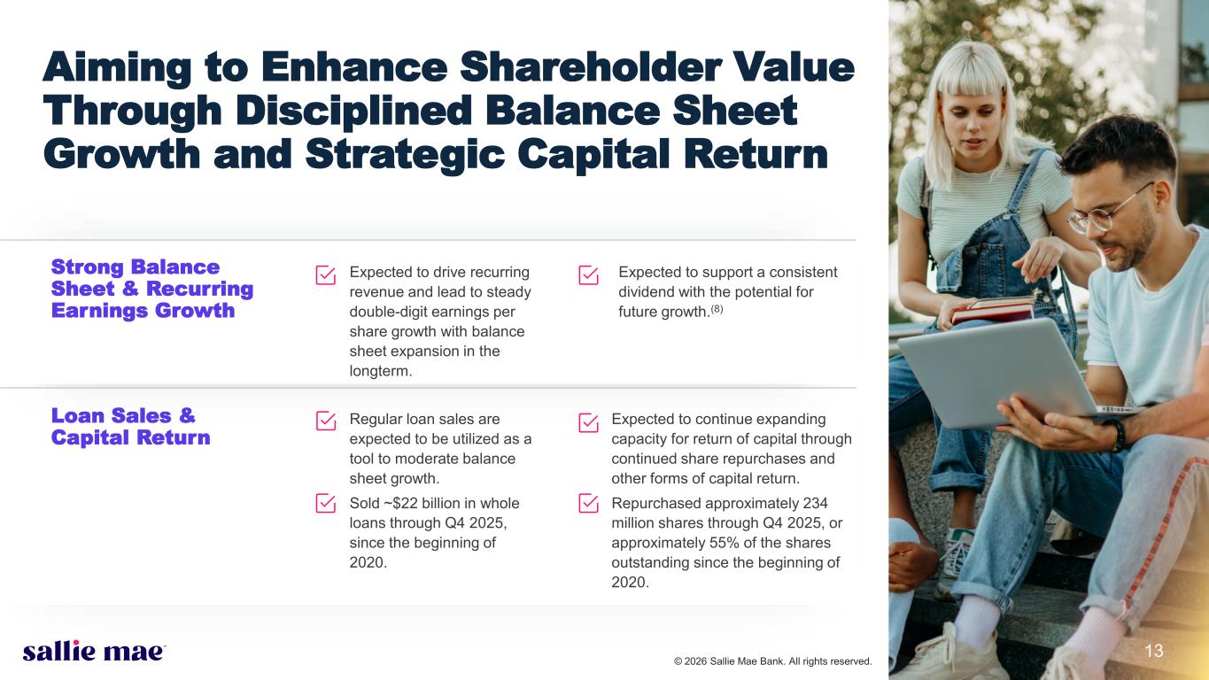 12© 2026 Sallie Mae Bank. All rights reserved. v Optimize the Value of the Brand and Attractive Client Base We know our customers’ finances, payment patterns, and indebtedness. We have relationships and knowledge to assist our customers with their next step: post-graduation plans, jobs, and future financial needs. We are there for our customers during and after their important transition to adulthood. Ensure products and services are consistent with our core mission and drive customer value Build products and services that leverage our customer affiliation Prioritize partnerships and other capital efficient avenues of growth Look for opportunities to optimize ROI WHAT WE DO