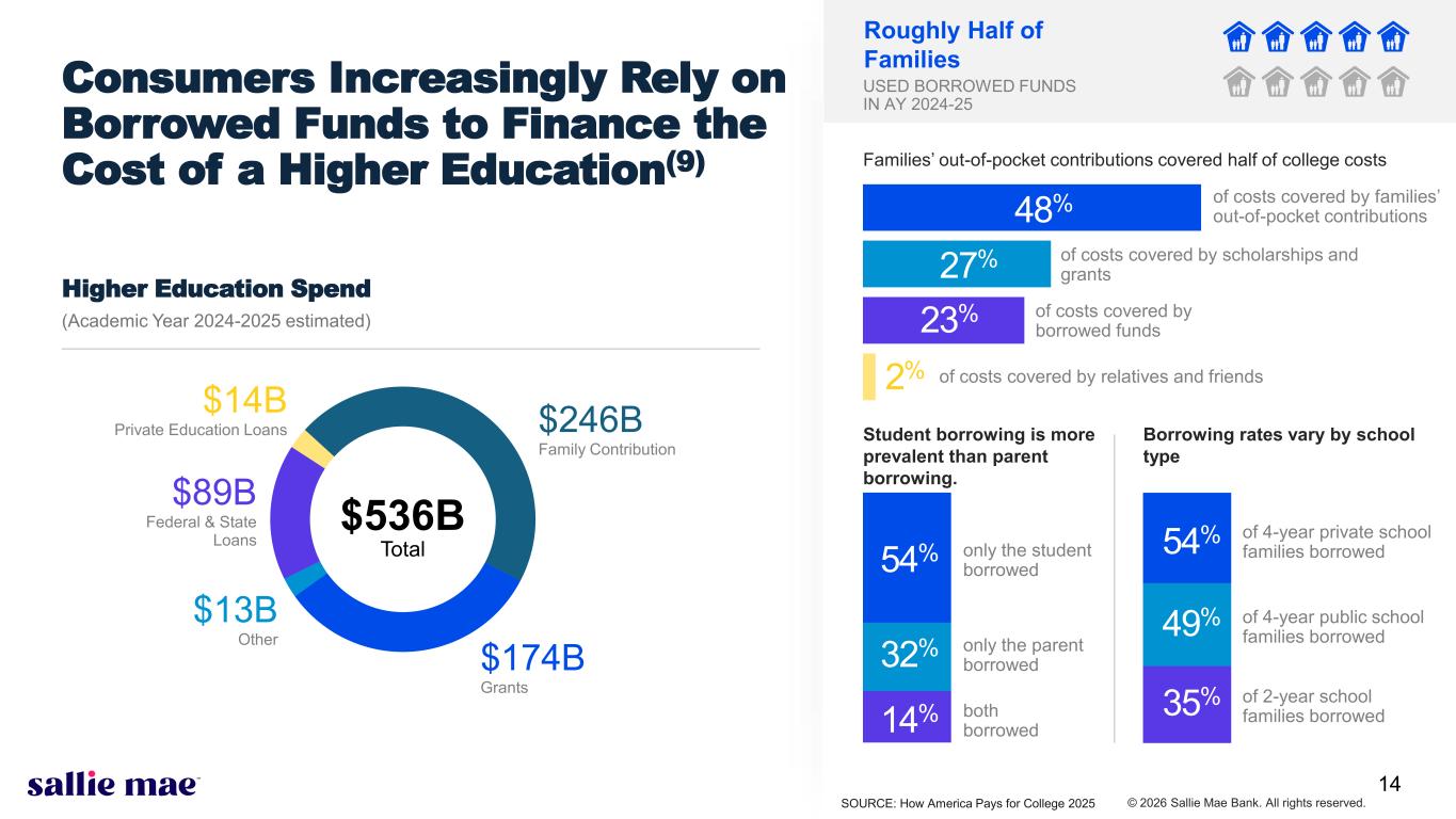 14© 2026 Sallie Mae Bank. All rights reserved. Consumers Increasingly Rely on Borrowed Funds to Finance the Cost of a Higher Education(9) Roughly Half of Families Student borrowing is more prevalent than parent borrowing. Borrowing rates vary by school type USED BORROWED FUNDS IN AY 2024-25 SOURCE: How America Pays for College 2025 Families’ out-of-pocket contributions covered half of college costs $246B Family Contribution $174B Grants $13B Other $14B Private Education Loans Higher Education Spend (Academic Year 2024-2025 estimated) $89B Federal & State Loans $536B Total 54% only the student borrowed 32% only the parent borrowed 14% both borrowed 54% of 4-year private school families borrowed 49% of 4-year public school families borrowed 35% of 2-year school families borrowed of costs covered by families’ out-of-pocket contributions of costs covered by scholarships and grants of costs covered by borrowed funds of costs covered by relatives and friends 48% 27% 23% 2% © 2026 Sallie Mae Bank. All rights reserved.
