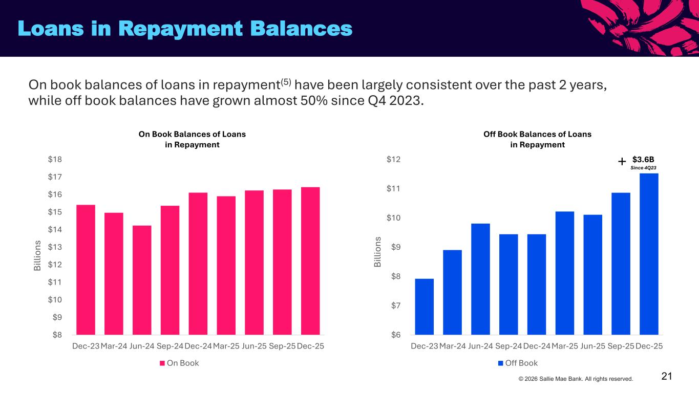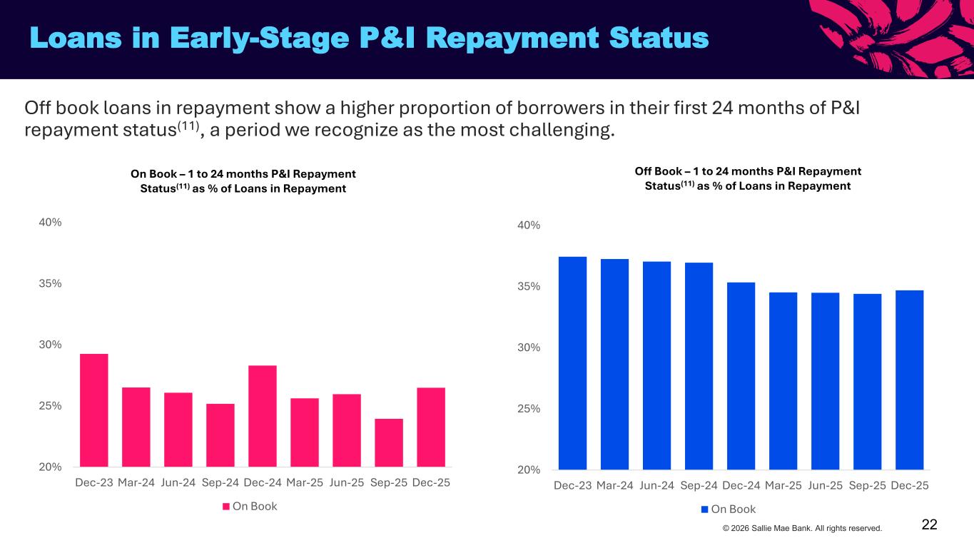 22© 2026 Sallie Mae Bank. All rights reserved. 20% 25% 30% 35% 40% Dec-23 Mar-24 Jun-24 Sep-24 Dec-24 Mar-25 Jun-25 Sep-25 Dec-25 On Book 20% 25% 30% 35% 40% Dec-23 Mar-24 Jun-24 Sep-24 Dec-24 Mar-25 Jun-25 Sep-25 Dec-25 On Book On Book – 1 to 24 months P&I Repayment Status(11) as % of Loans in Repayment Off Book – 1 to 24 months P&I Repayment Status(11) as % of Loans in Repayment Off book loans in repayment show a higher proportion of borrowers in their first 24 months of P&I repayment status(11), a period we recognize as the most challenging. Loans in Early-Stage P&I Repayment Status