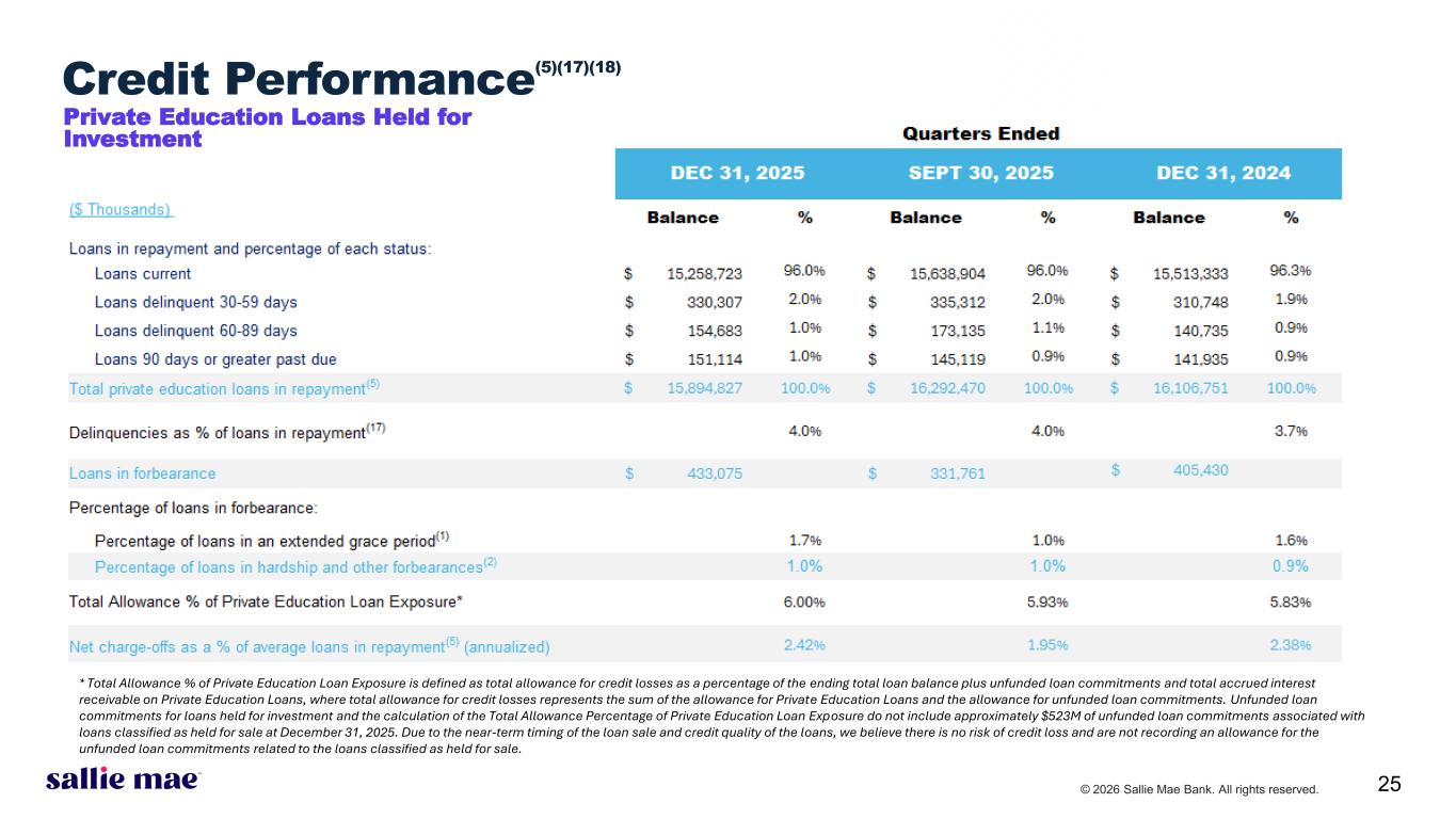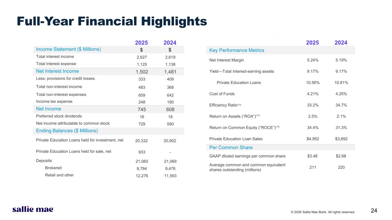 23© 2026 Sallie Mae Bank. All rights reserved. Q4 2025 Q3 2025 Q4 2024 Income Statement ($ Millions) $ $ $ Total interest income 657 658 661 Total interest expense 280 285 299 Net Interest Income 377 373 362 Less: provisions for credit losses (19) 179 108 Total non-interest income 77 173 28 Total non-interest expenses 157 180 150 Income tax expense 83 50 21 Net Income 233 136 112 Preferred stock dividends 4 4 4 Net income attributable to common stock 229 132 107 Ending Balances ($ Millions) Private Education Loans held for investment, net 20,332 21,615 20,902 Private Education Loans held for sale, net 933 - - Deposits 21,060 20,012 21,069 Brokered 8.784 7,738 9,476 Retail and other 12,276 12,274 11,593 Q4 2025 Q3 2025 Q4 2024 Key Performance Metrics Net Interest Margin 5.21% 5.18% 4.92% Yield—Total Interest-earning assets 9.07% 9.14% 8.98% Private Education Loans 10.44% 10.58% 10.54% Cost of Funds 4.14% 4.24% 4.31% Efficiency Ratio(14) 34.6% 33.0% 38.5% Return on Assets (“ROA”)(15) 3.1% 1.9% 1.5% Return on Common Equity (“ROCE”)(16) 42.2% 24.3% 22.5% Private Education Loan Sales $1,014 $1,936 $- Per Common Share GAAP diluted earnings per common share $1.12 $0.63 $0.50 Average common and common equivalent shares outstanding (millions) 205 211 215 Quarterly Financial Highlights