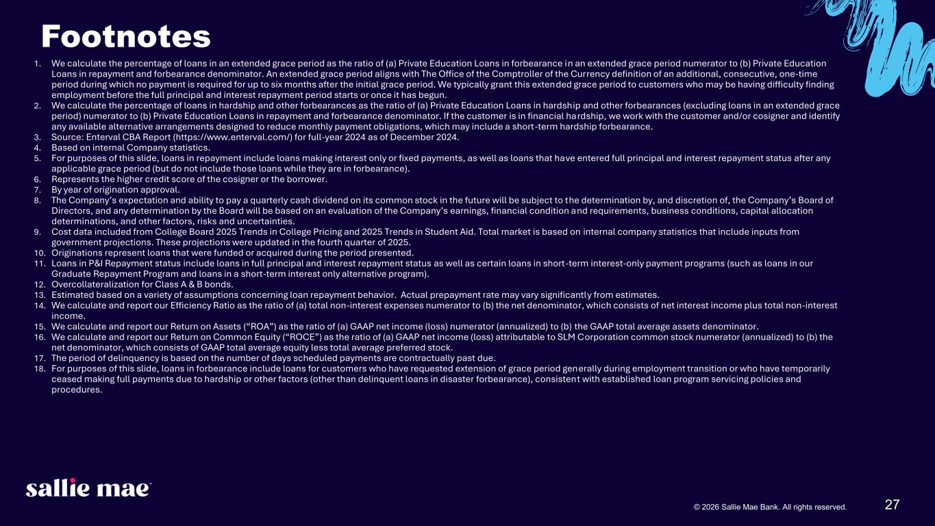 27© 2026 Sallie Mae Bank. All rights reserved. 1. We calculate the percentage of loans in an extended grace period as the ratio of (a) Private Education Loans in forbearance in an extended grace period numerator to (b) Private Education Loans in repayment and forbearance denominator. An extended grace period aligns with The Office of the Comptroller of the Currency definition of an additional, consecutive, one-time period during which no payment is required for up to six months after the initial grace period. We typically grant this extended grace period to customers who may be having difficulty finding employment before the full principal and interest repayment period starts or once it has begun. 2. We calculate the percentage of loans in hardship and other forbearances as the ratio of (a) Private Education Loans in hardship and other forbearances (excluding loans in an extended grace period) numerator to (b) Private Education Loans in repayment and forbearance denominator. If the customer is in financial hardship, we work with the customer and/or cosigner and identify any available alternative arrangements designed to reduce monthly payment obligations, which may include a short-term hardship forbearance. 3. Source: Enterval CBA Report (https://www.enterval.com/) for full-year 2024 as of December 2024. 4. Based on internal Company statistics. 5. For purposes of this slide, loans in repayment include loans making interest only or fixed payments, as well as loans that have entered full principal and interest repayment status after any applicable grace period (but do not include those loans while they are in forbearance). 6. Represents the higher credit score of the cosigner or the borrower. 7. By year of origination approval. 8. The Company’s expectation and ability to pay a quarterly cash dividend on its common stock in the future will be subject to the determination by, and discretion of, the Company’s Board of Directors, and any determination by the Board will be based on an evaluation of the Company’s earnings, financial condition and requirements, business conditions, capital allocation determinations, and other factors, risks and uncertainties. 9. Cost data included from College Board 2025 Trends in College Pricing and 2025 Trends in Student Aid. Total market is based on internal company statistics that include inputs from government projections. These projections were updated in the fourth quarter of 2025. 10. Originations represent loans that were funded or acquired during the period presented. 11. Loans in P&I Repayment status include loans in full principal and interest repayment status as well as certain loans in short-term interest-only payment programs (such as loans in our Graduate Repayment Program and loans in a short-term interest only alternative program). 12. Overcollateralization for Class A & B bonds. 13. Estimated based on a variety of assumptions concerning loan repayment behavior. Actual prepayment rate may vary significantly from estimates. 14. We calculate and report our Efficiency Ratio as the ratio of (a) total non-interest expenses numerator to (b) the net denominator, which consists of net interest income plus total non-interest income. 15. We calculate and report our Return on Assets (“ROA”) as the ratio of (a) GAAP net income (loss) numerator (annualized) to (b) the GAAP total average assets denominator. 16. We calculate and report our Return on Common Equity (“ROCE”) as the ratio of (a) GAAP net income (loss) attributable to SLM Corporation common stock numerator (annualized) to (b) the net denominator, which consists of GAAP total average equity less total average preferred stock. 17. The period of delinquency is based on the number of days scheduled payments are contractually past due. 18. For purposes of this slide, loans in forbearance include loans for customers who have requested extension of grace period generally during employment transition or who have temporarily ceased making full payments due to hardship or other factors (other than delinquent loans in disaster forbearance), consistent with established loan program servicing policies and procedures. Footnotes