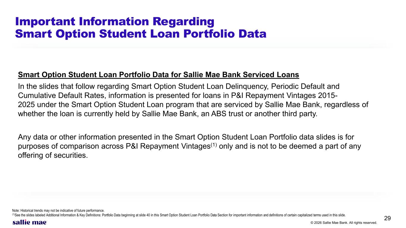 28© 2026 Sallie Mae Bank. All rights reserved. Smart Option Student Loan Historical Portfolio Data Summary