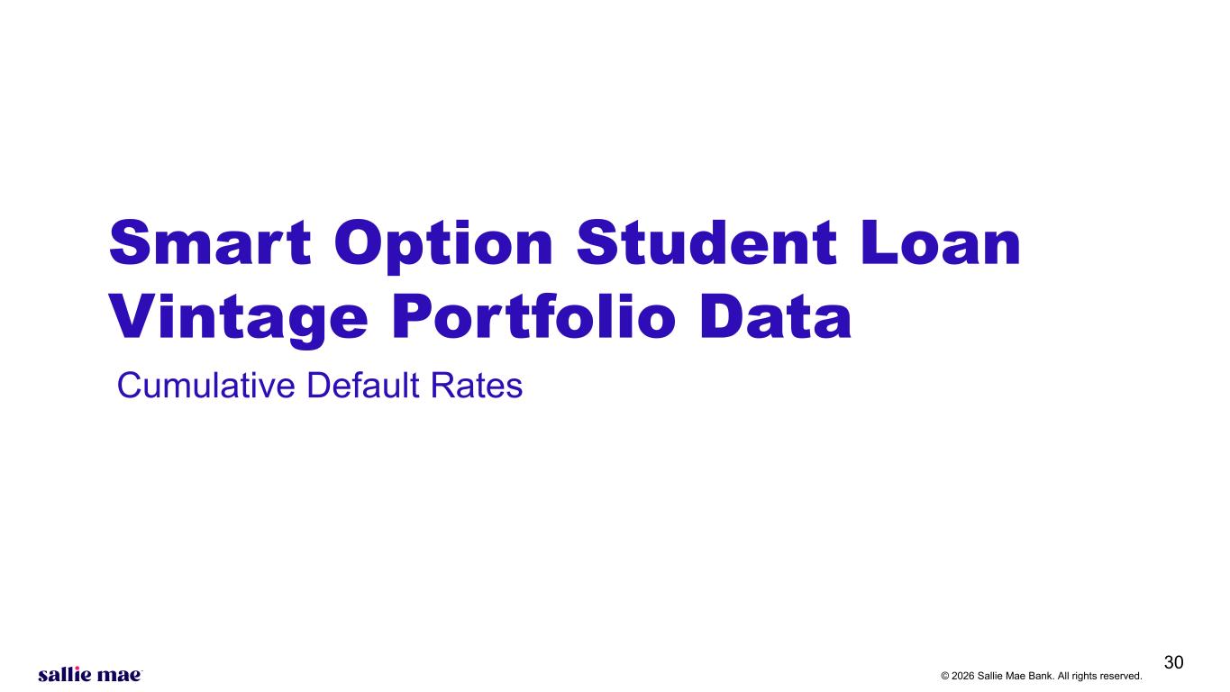 29 © 2026 Sallie Mae Bank. All rights reserved. Important Information Regarding Smart Option Student Loan Portfolio Data Smart Option Student Loan Portfolio Data for Sallie Mae Bank Serviced Loans In the slides that follow regarding Smart Option Student Loan Delinquency, Periodic Default and Cumulative Default Rates, information is presented for loans in P&I Repayment Vintages 2015- 2025 under the Smart Option Student Loan program that are serviced by Sallie Mae Bank, regardless of whether the loan is currently held by Sallie Mae Bank, an ABS trust or another third party. Any data or other information presented in the Smart Option Student Loan Portfolio data slides is for purposes of comparison across P&I Repayment Vintages(1) only and is not to be deemed a part of any offering of securities. Note: Historical trends may not be indicative of future performance. (1)See the slides labeled Additional Information & Key Definitions: Portfolio Data beginning at slide 40 in this Smart Option Student Loan Portfolio Data Section for important information and definitions of certain capitalized terms used in this slide.