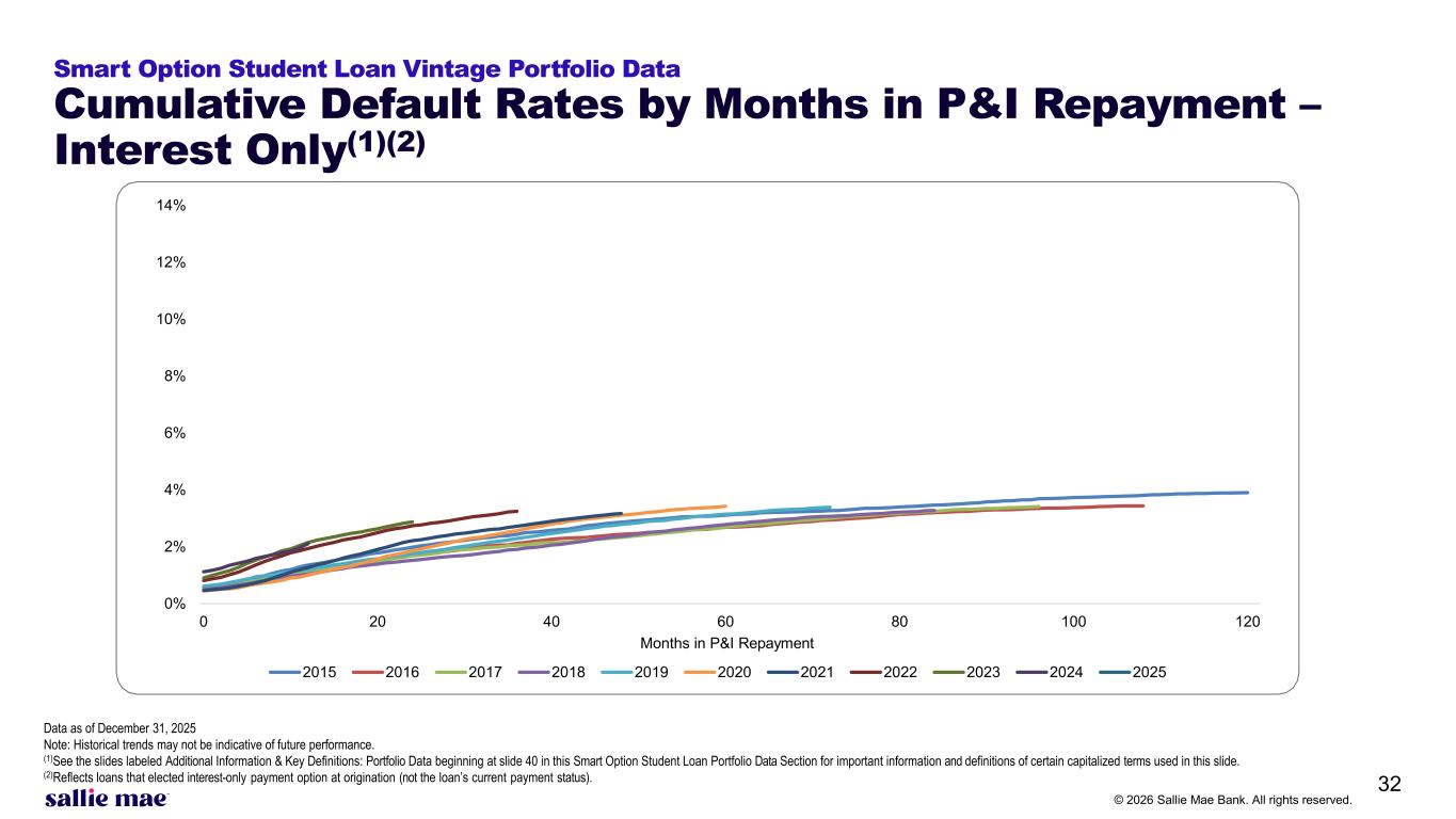 31 © 2026 Sallie Mae Bank. All rights reserved. 0% 2% 4% 6% 8% 10% 12% 14% 0 20 40 60 80 100 120 2015 2016 2017 2018 2019 2020 2021 2022 2023 2024 2025 Smart Option Student Loan Vintage Portfolio Data Cumulative Default Rates by Months in P&I Repayment(1) Months in P&I Repayment Data as of December 31, 2025 Note: Historical trends may not be indicative of future performance. (1)See the slides labeled Additional Information & Key Definitions: Portfolio Data beginning at slide 40 in this Smart Option Student Loan Portfolio Data Section for important information and definitions of certain capitalized terms used in this slide.