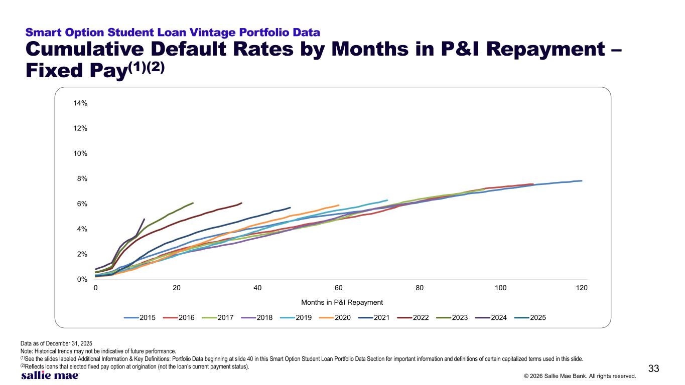 32 © 2026 Sallie Mae Bank. All rights reserved. 0% 2% 4% 6% 8% 10% 12% 14% 0 20 40 60 80 100 120 2015 2016 2017 2018 2019 2020 2021 2022 2023 2024 2025 Smart Option Student Loan Vintage Portfolio Data Cumulative Default Rates by Months in P&I Repayment – Interest Only(1)(2) Data as of December 31, 2025 Note: Historical trends may not be indicative of future performance. (1)See the slides labeled Additional Information & Key Definitions: Portfolio Data beginning at slide 40 in this Smart Option Student Loan Portfolio Data Section for important information and definitions of certain capitalized terms used in this slide. (2)Reflects loans that elected interest-only payment option at origination (not the loan’s current payment status). Months in P&I Repayment