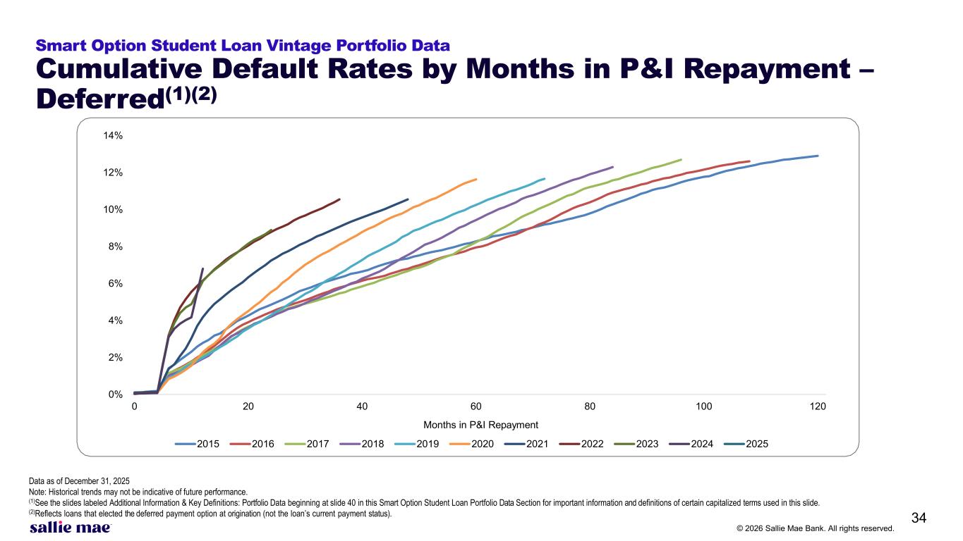 33 © 2026 Sallie Mae Bank. All rights reserved. 0% 2% 4% 6% 8% 10% 12% 14% 0 20 40 60 80 100 120 2015 2016 2017 2018 2019 2020 2021 2022 2023 2024 2025 Smart Option Student Loan Vintage Portfolio Data Cumulative Default Rates by Months in P&I Repayment – Fixed Pay(1)(2) Data as of December 31, 2025 Note: Historical trends may not be indicative of future performance. (1)See the slides labeled Additional Information & Key Definitions: Portfolio Data beginning at slide 40 in this Smart Option Student Loan Portfolio Data Section for important information and definitions of certain capitalized terms used in this slide. (2)Reflects loans that elected fixed pay option at origination (not the loan’s current payment status). Months in P&I Repayment