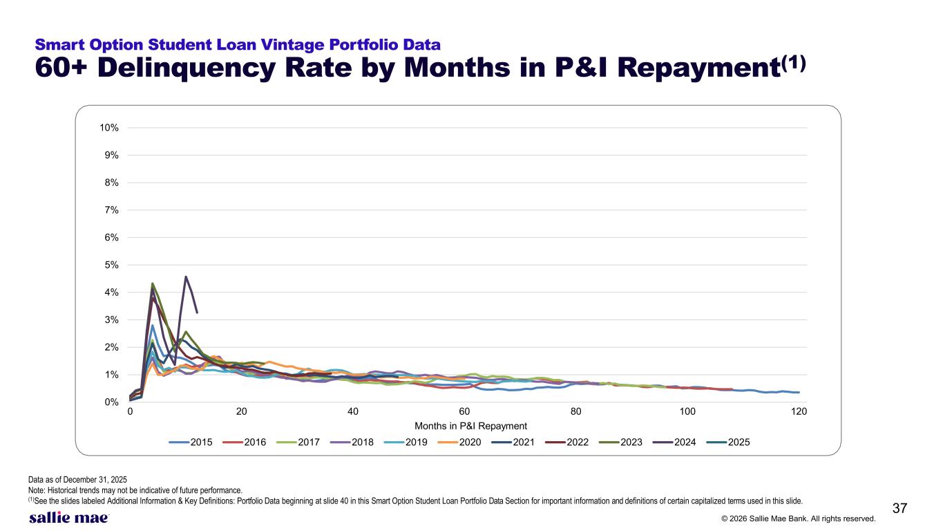 36 © 2026 Sallie Mae Bank. All rights reserved. 0% 1% 2% 3% 4% 5% 6% 7% 8% 9% 10% 0 20 40 60 80 100 120 2015 2016 2017 2018 2019 2020 2021 2022 2023 2024 2025 Smart Option Student Loan Vintage Portfolio Data 30+ Delinquency Rate by Months in P&I Repayment(1) Data as of December 31, 2025 Note: Historical trends may not be indicative of future performance. (1)See the slides labeled Additional Information & Key Definitions: Portfolio Data beginning at slide 40 in this Smart Option Student Loan Portfolio Data Section for important information and definitions of certain capitalized terms used in this slide. Months in P&I Repayment