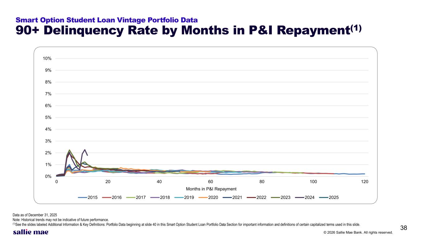 37 © 2026 Sallie Mae Bank. All rights reserved. 0% 1% 2% 3% 4% 5% 6% 7% 8% 9% 10% 0 20 40 60 80 100 120 2015 2016 2017 2018 2019 2020 2021 2022 2023 2024 2025 Smart Option Student Loan Vintage Portfolio Data 60+ Delinquency Rate by Months in P&I Repayment(1) Data as of December 31, 2025 Note: Historical trends may not be indicative of future performance. (1)See the slides labeled Additional Information & Key Definitions: Portfolio Data beginning at slide 40 in this Smart Option Student Loan Portfolio Data Section for important information and definitions of certain capitalized terms used in this slide. Months in P&I Repayment