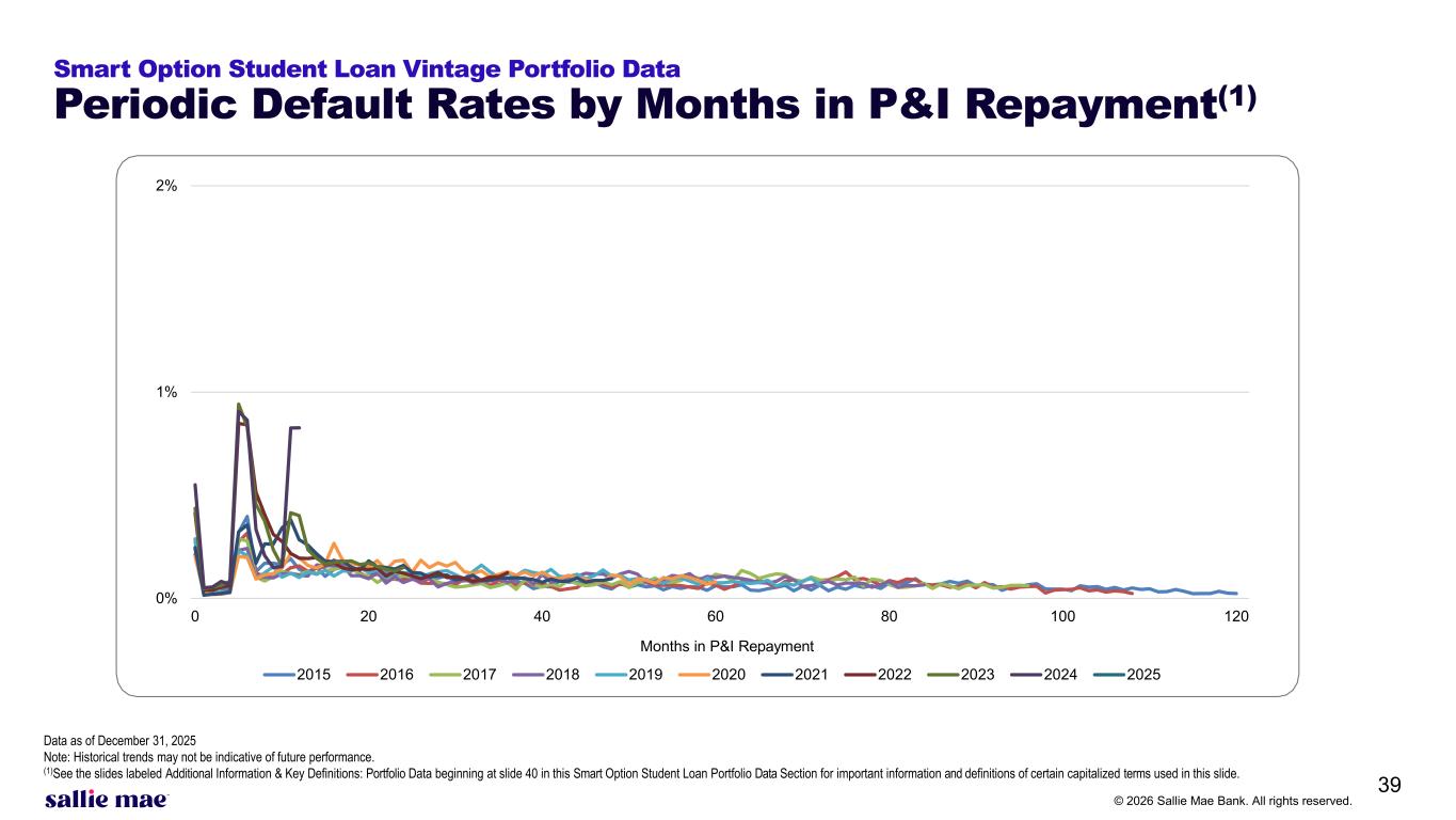 38 © 2026 Sallie Mae Bank. All rights reserved. 0% 1% 2% 3% 4% 5% 6% 7% 8% 9% 10% 0 20 40 60 80 100 120 2015 2016 2017 2018 2019 2020 2021 2022 2023 2024 2025 Smart Option Student Loan Vintage Portfolio Data 90+ Delinquency Rate by Months in P&I Repayment(1) Data as of December 31, 2025 Note: Historical trends may not be indicative of future performance. (1)See the slides labeled Additional Information & Key Definitions: Portfolio Data beginning at slide 40 in this Smart Option Student Loan Portfolio Data Section for important information and definitions of certain capitalized terms used in this slide. Months in P&I Repayment