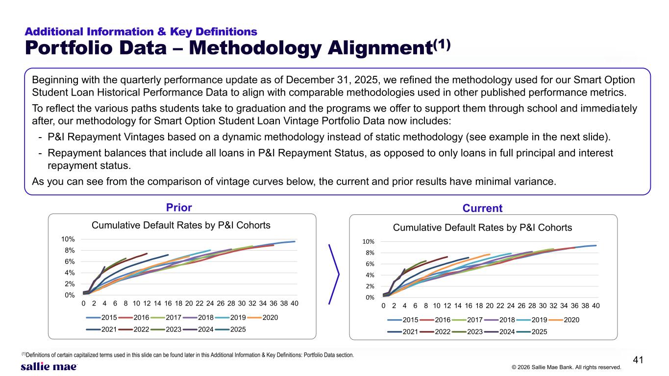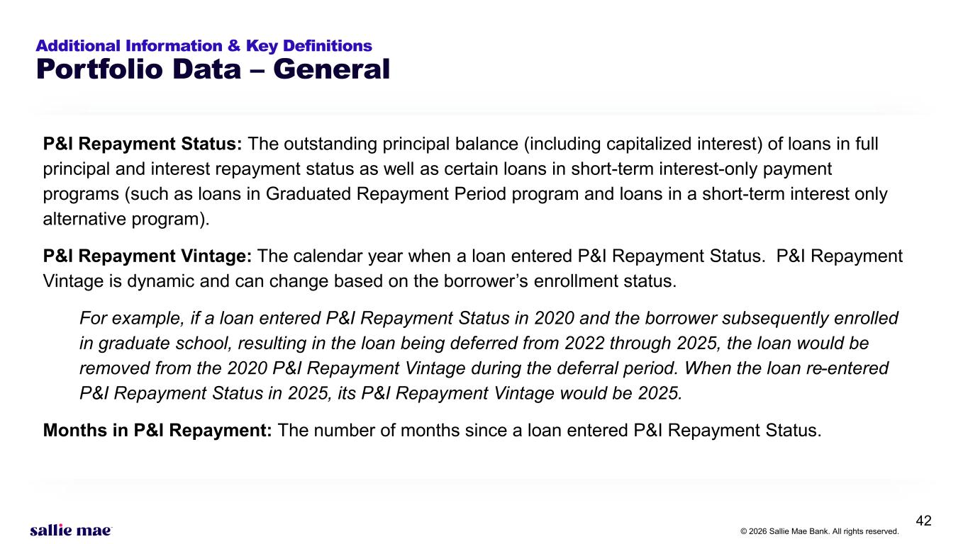 41 © 2026 Sallie Mae Bank. All rights reserved. Additional Information & Key Definitions Portfolio Data – Methodology Alignment(1) Beginning with the quarterly performance update as of December 31, 2025, we refined the methodology used for our Smart Option Student Loan Historical Performance Data to align with comparable methodologies used in other published performance metrics. To reflect the various paths students take to graduation and the programs we offer to support them through school and immediately after, our methodology for Smart Option Student Loan Vintage Portfolio Data now includes: - P&I Repayment Vintages based on a dynamic methodology instead of static methodology (see example in the next slide). - Repayment balances that include all loans in P&I Repayment Status, as opposed to only loans in full principal and interest repayment status. As you can see from the comparison of vintage curves below, the current and prior results have minimal variance. 0% 2% 4% 6% 8% 10% 0 2 4 6 8 10 12 14 16 18 20 22 24 26 28 30 32 34 36 38 40 Cumulative Default Rates by P&I Cohorts 2015 2016 2017 2018 2019 2020 2021 2022 2023 2024 2025 0% 2% 4% 6% 8% 10% 0 2 4 6 8 10 12 14 16 18 20 22 24 26 28 30 32 34 36 38 40 Cumulative Default Rates by P&I Cohorts 2015 2016 2017 2018 2019 2020 2021 2022 2023 2024 2025 Prior Current (1)Definitions of certain capitalized terms used in this slide can be found later in this Additional Information & Key Definitions: Portfolio Data section.