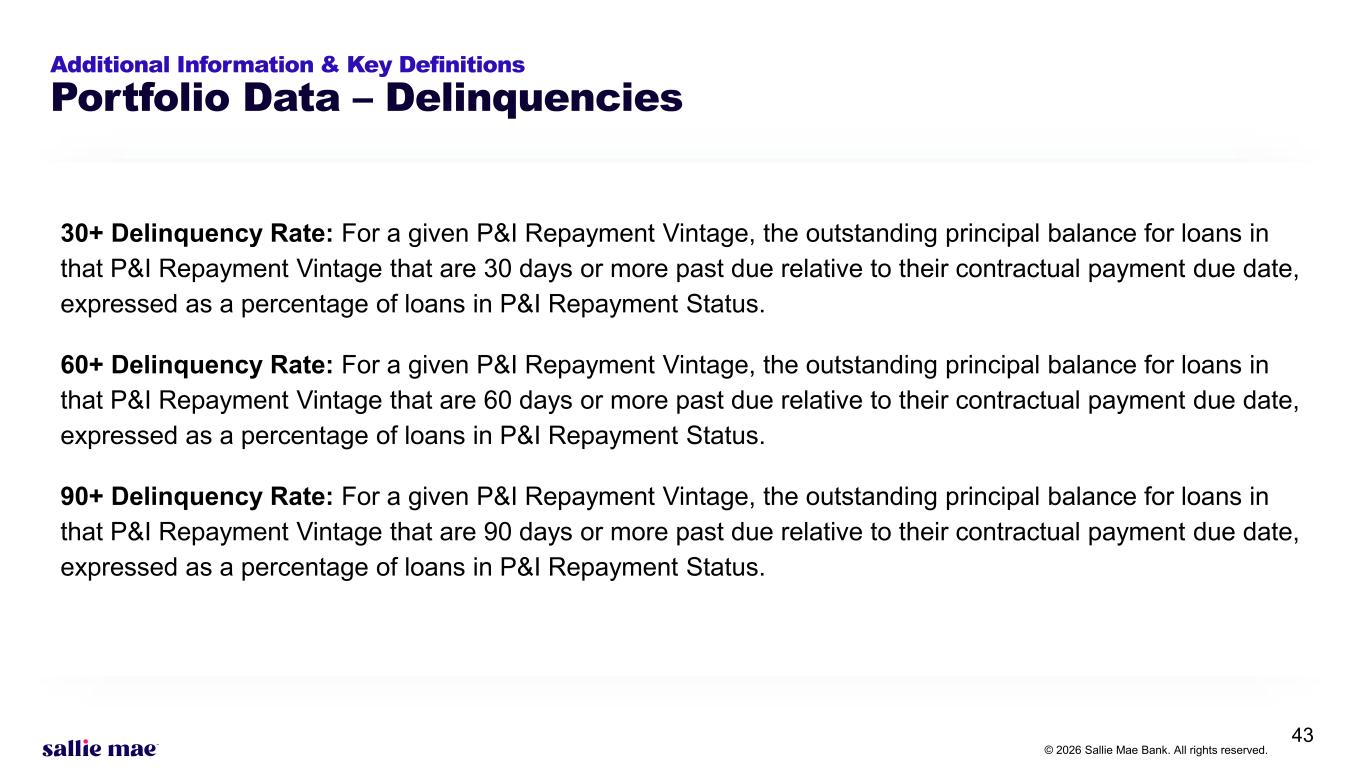 42 © 2026 Sallie Mae Bank. All rights reserved. Additional Information & Key Definitions Portfolio Data – General P&I Repayment Status: The outstanding principal balance (including capitalized interest) of loans in full principal and interest repayment status as well as certain loans in short-term interest-only payment programs (such as loans in Graduated Repayment Period program and loans in a short-term interest only alternative program). P&I Repayment Vintage: The calendar year when a loan entered P&I Repayment Status. P&I Repayment Vintage is dynamic and can change based on the borrower’s enrollment status. For example, if a loan entered P&I Repayment Status in 2020 and the borrower subsequently enrolled in graduate school, resulting in the loan being deferred from 2022 through 2025, the loan would be removed from the 2020 P&I Repayment Vintage during the deferral period. When the loan re-entered P&I Repayment Status in 2025, its P&I Repayment Vintage would be 2025. Months in P&I Repayment: The number of months since a loan entered P&I Repayment Status.