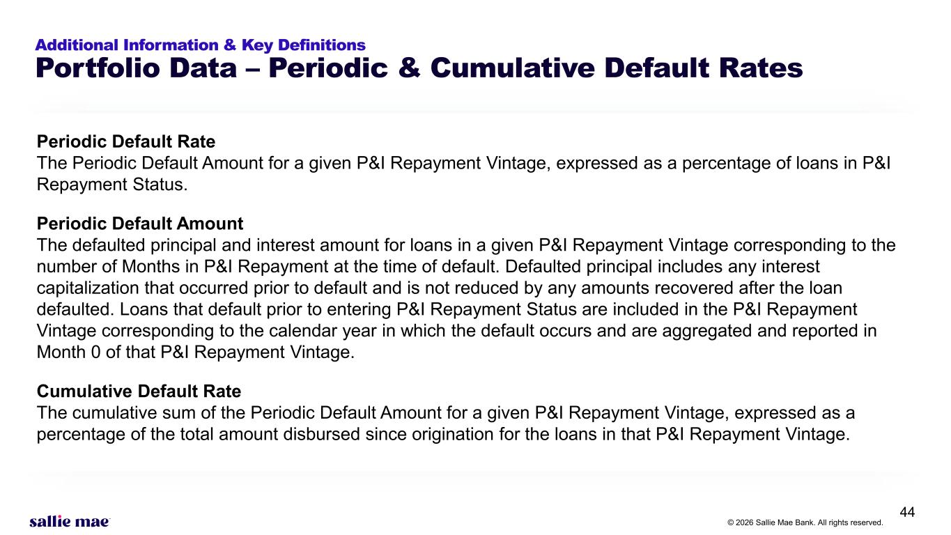 43 © 2026 Sallie Mae Bank. All rights reserved. Additional Information & Key Definitions Portfolio Data – Delinquencies 30+ Delinquency Rate: For a given P&I Repayment Vintage, the outstanding principal balance for loans in that P&I Repayment Vintage that are 30 days or more past due relative to their contractual payment due date, expressed as a percentage of loans in P&I Repayment Status. 60+ Delinquency Rate: For a given P&I Repayment Vintage, the outstanding principal balance for loans in that P&I Repayment Vintage that are 60 days or more past due relative to their contractual payment due date, expressed as a percentage of loans in P&I Repayment Status. 90+ Delinquency Rate: For a given P&I Repayment Vintage, the outstanding principal balance for loans in that P&I Repayment Vintage that are 90 days or more past due relative to their contractual payment due date, expressed as a percentage of loans in P&I Repayment Status.