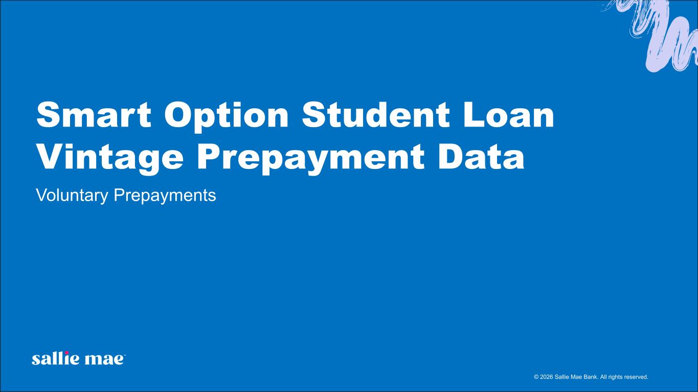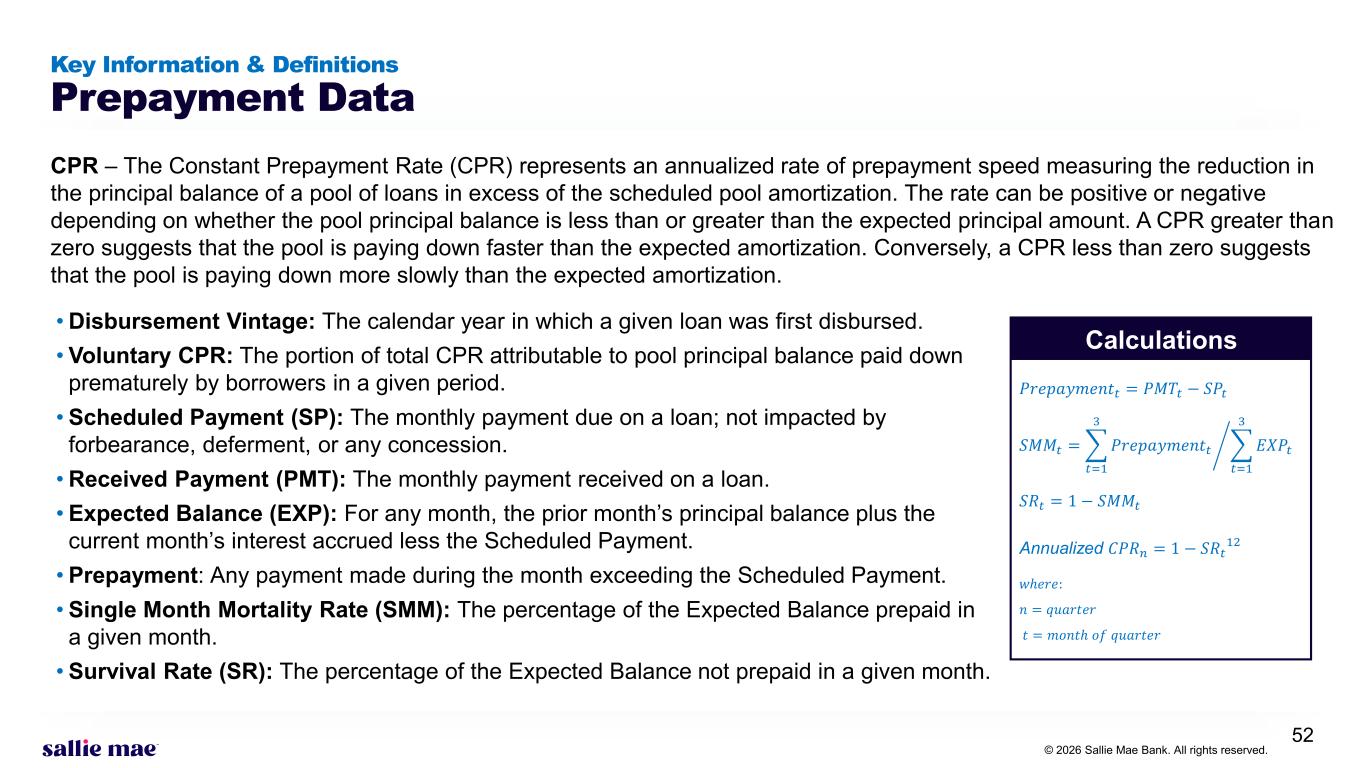 52 © 2026 Sallie Mae Bank. All rights reserved. Key Information & Definitions Prepayment Data CPR – The Constant Prepayment Rate (CPR) represents an annualized rate of prepayment speed measuring the reduction in the principal balance of a pool of loans in excess of the scheduled pool amortization. The rate can be positive or negative depending on whether the pool principal balance is less than or greater than the expected principal amount. A CPR greater than zero suggests that the pool is paying down faster than the expected amortization. Conversely, a CPR less than zero suggests that the pool is paying down more slowly than the expected amortization. • Disbursement Vintage: The calendar year in which a given loan was first disbursed. • Voluntary CPR: The portion of total CPR attributable to pool principal balance paid down prematurely by borrowers in a given period. • Scheduled Payment (SP): The monthly payment due on a loan; not impacted by forbearance, deferment, or any concession. • Received Payment (PMT): The monthly payment received on a loan. • Expected Balance (EXP): For any month, the prior month’s principal balance plus the current month’s interest accrued less the Scheduled Payment. • Prepayment: Any payment made during the month exceeding the Scheduled Payment. • Single Month Mortality Rate (SMM): The percentage of the Expected Balance prepaid in a given month. • Survival Rate (SR): The percentage of the Expected Balance not prepaid in a given month. Calculations 𝑃𝑟𝑒𝑝𝑎𝑦𝑚𝑒𝑛𝑡𝑡 = 𝑃𝑀𝑇𝑡 − 𝑆𝑃𝑡 𝑆𝑀𝑀𝑡 = ൙෍ 𝑡=1 3 𝑃𝑟𝑒𝑝𝑎𝑦𝑚𝑒𝑛𝑡𝑡 ෍ 𝑡=1 3 𝐸𝑋𝑃𝑡 𝑆𝑅𝑡 = 1 − 𝑆𝑀𝑀𝑡 Annualized 𝐶𝑃𝑅𝑛 = 1 − 𝑆𝑅𝑡 12 𝑤ℎ𝑒𝑟𝑒: 𝑛 = 𝑞𝑢𝑎𝑟𝑡𝑒𝑟 𝑡 = 𝑚𝑜𝑛𝑡ℎ 𝑜𝑓 𝑞𝑢𝑎𝑟𝑡𝑒𝑟